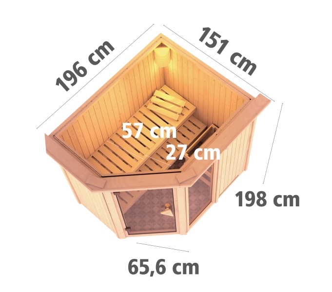 Menší finská sauna určená pro dvě osoby. Má rozměr š 196 x h 151 x v 198 cm s rohovými dveřmi. Tento model finské sauny má 1 okno o rozměru š 49 x v 175,5 cm. Sauna je určená do temperovaných interiérů domu nebo bytu. Její výrobce, firma KARIBU HOLZTECHNIK z německých Brém, dokázala svými výrobky úspěšně navázat na staletou tradici skandinávského saunování a současně do ní zapracovat dnešní moderní technologie.