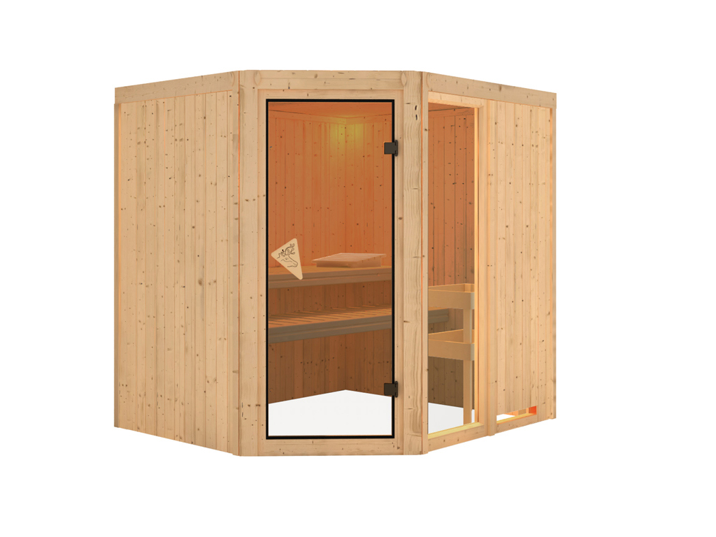 Finská sauna určená pro dvě osoby. Má rozměr š 196 x h 170 x v 198 cm s rohovými dveřmi. Tento model finské sauny má 1 okno o rozměru š 49 x v 175,5 cm. Sauna je určená do temperovaných interiérů domu nebo bytu. Její výrobce, firma KARIBU HOLZTECHNIK z německých Brém, dokázala svými výrobky úspěšně navázat na staletou tradici skandinávského saunování a současně do ní zapracovat dnešní moderní technologie.