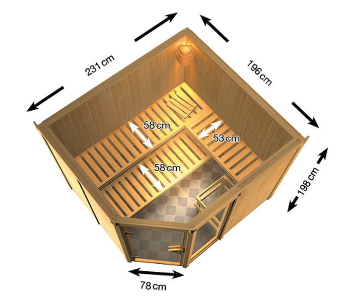 Finská sauna určená pro tři osoby. Má rozměr š 231 x h 196 x v 198 cm s rohovými dveřmi. Tento model finské sauny má 1 okno o rozměru š 49 x v 175,5 cm. Sauna je určená do temperovaných interiérů domu nebo bytu. Její výrobce, firma KARIBU HOLZTECHNIK z německých Brém, dokázala svými výrobky úspěšně navázat na staletou tradici skandinávského saunování a současně do ní zapracovat dnešní moderní technologie.