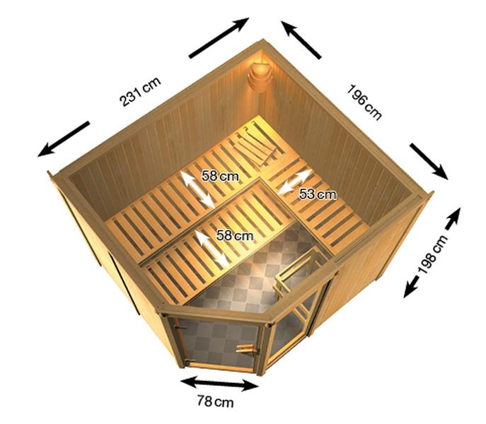 Finská sauna určená pro tři osoby. Má rozměr š 231 x h 196 x v 198 cm s rohovými dveřmi. Tento model finské sauny má 1 okno o rozměru š 49 x v 175,5 cm. Sauna je určená do temperovaných interiérů domu nebo bytu. Její výrobce, firma KARIBU HOLZTECHNIK z německých Brém, dokázala svými výrobky úspěšně navázat na staletou tradici skandinávského saunování a současně do ní zapracovat dnešní moderní technologie.