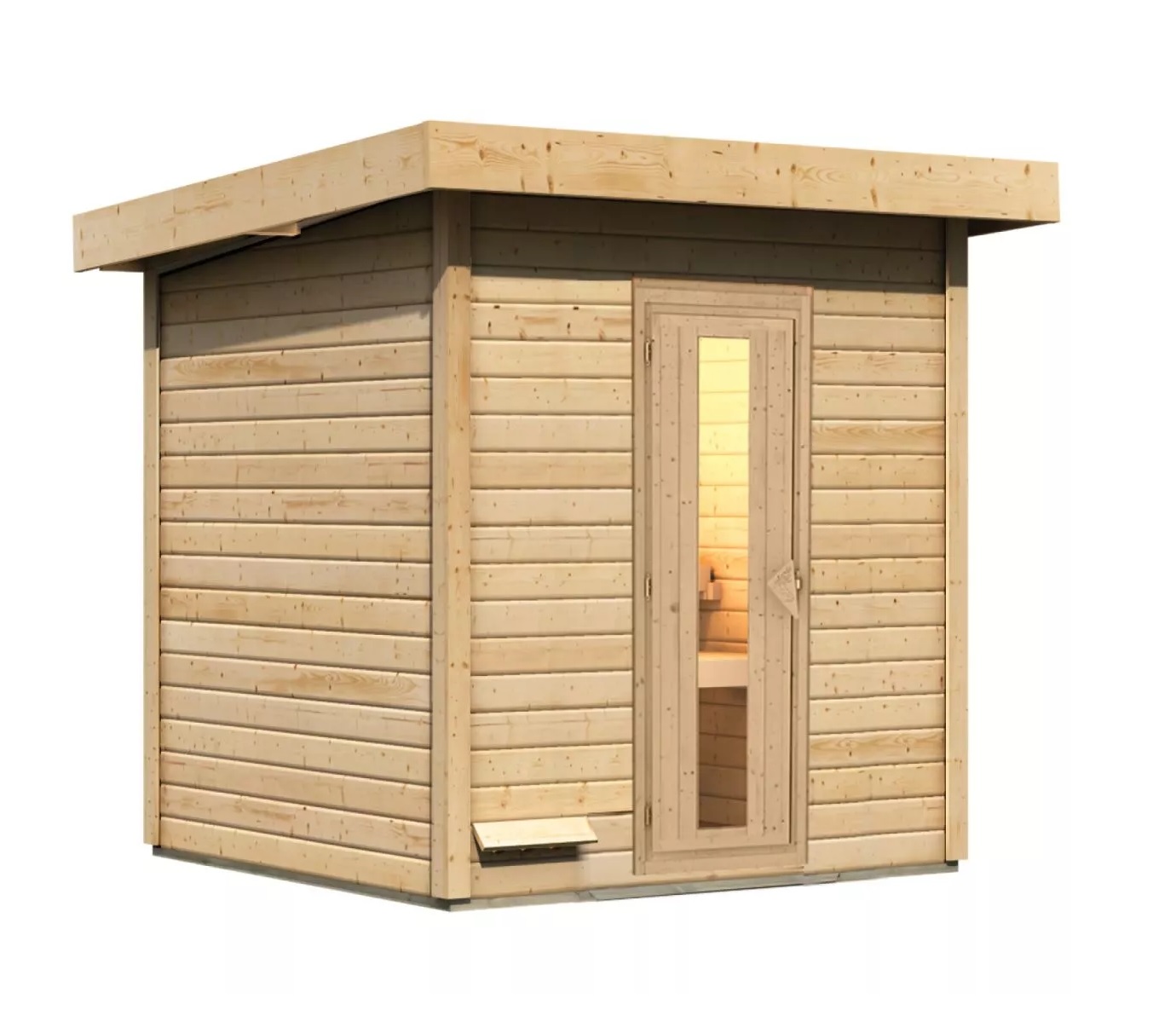 Venkovní model finské sauny pro vaši zahradu. Sauna je určená pro 2 ležící osoby. Její výrobce, firma KARIBU HOLZTECHNIK z německých Brém, dokázala svými výrobky úspěšně navázat na staletou tradici skandinávského saunování a současně do ní zapracovat dnešní moderní technologie. Dodáváme jako stavebnici v rozloženém stavu, kde stěny tvoří jednotlivé dřevěné profily, které pouze sesadíte k sobě a sešroubujete, střechu tvoří celistvá deska. To garantuje jednoduchou montáž, kterou zvládne každý domácí kutil. Stěny sauny jsou složeny ze speciálně hlazených prken s dvojitým perem a drážkou, což garantuje neobyčejnou pevnost spoje.