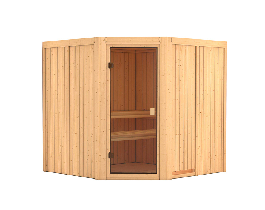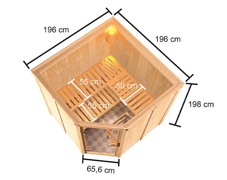 Finská sauna určená pro tři osoby. Má čtvercový tvar š 196 x h 196 x v 198 cm. Tento model finské sauny je určený do temperovaných interiérů domu nebo bytu. Její výrobce, firma KARIBU HOLZTECHNIK z německých Brém, dokázala svými výrobky úspěšně navázat na staletou tradici skandinávského saunování a současně do ní zapracovat dnešní moderní technologie. Sauna je celá vyrobena ze dřeva severského smrku v přírodním provedení. Dřevo pochází ze vzdáleného severu Evropy a je chemicky naprosto neošetřené (není ani namořeno ani nalakováno). V důsledku toho je prosté všech známých problematických látek, které by se v průběhu saunování mohly ze dřeva uvolňovat. Tato interiérová sauna vykazuje mimořádné tepelně-izolační vlastnosti. Stěny sauny jsou složeny z vnitřní a vnější vrstvy speciálně hlazených prken s perem a drážkou, mezi kterými je 42 mm silná tepelná izolace v podobě minerální vlny. Celková síla stěny je tak 68 mm. Zadní nebo boční nepohledové strany orientované ke stěně místnosti mají vnější stranu ze sololitu. Proto jsou při stejné tepelné izolaci o cca 10 mm tenčí než pohledové strany pokryté palubkami.