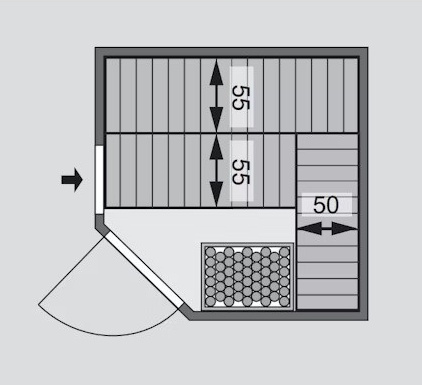 Obsahem standardního balení je 3x lavice ze smrkového dřeva (2x šířka 55 cm, 1x šířka 50 cm, max 250 kg), 1x podhlavník a dřevěný ochranný rám na kamna. Doporučujeme další saunové příslušenství z naší nabídky.
