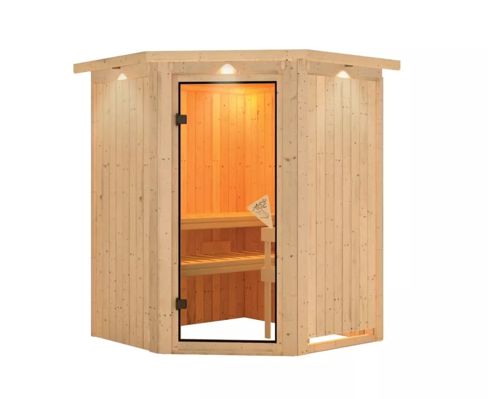 Malá finská sauna určená až pro dvě osoby. Má rozměr š 151 x h 151 x v 198 cm s rohovými dveřmi. Tento model finské sauny je určený do temperovaných interiérů domu nebo bytu. Její výrobce, firma KARIBU HOLZTECHNIK z německých Brém, dokázala svými výrobky úspěšně navázat na staletou tradici skandinávského saunování a současně do ní zapracovat dnešní moderní technologie. Sauna je celá vyrobena ze dřeva severského smrku v přírodním provedení. Dřevo pochází ze vzdáleného severu Evropy a je chemicky naprosto neošetřené (není ani namořeno ani nalakováno). V důsledku toho je prosté všech známých problematických látek, které by se v průběhu saunování mohly ze dřeva uvolňovat. Tato interiérová sauna vykazuje mimořádné tepelně-izolační vlastnosti. Stěny sauny jsou složeny z vnitřní a vnější vrstvy speciálně hlazených prken s perem a drážkou, mezi kterými je 42 mm silná tepelná izolace v podobě minerální vlny. Celková síla stěny je tak 68 mm. Zadní nebo boční nepohledové strany orientované ke stěně místnosti mají vnější stranu ze sololitu. Proto jsou při stejné tepelné izolaci o cca 10 mm tenčí než pohledové strany pokryté palubkami.
