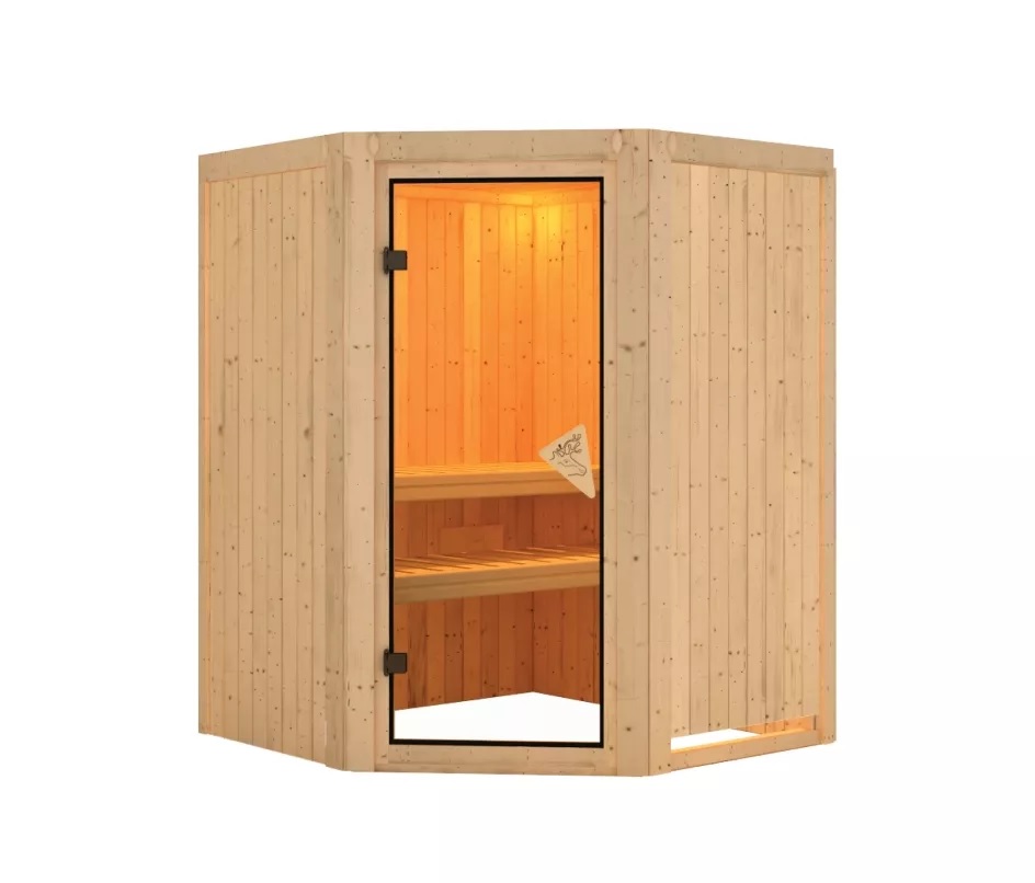 Malá finská sauna určená až pro dvě osoby. Má rozměr š 151 x h 151 x v 198 cm s rohovými dveřmi. Tento model finské sauny je určený do temperovaných interiérů domu nebo bytu. Její výrobce, firma KARIBU HOLZTECHNIK z německých Brém, dokázala svými výrobky úspěšně navázat na staletou tradici skandinávského saunování a současně do ní zapracovat dnešní moderní technologie. Sauna je celá vyrobena ze dřeva severského smrku v přírodním provedení. Dřevo pochází ze vzdáleného severu Evropy a je chemicky naprosto neošetřené (není ani namořeno ani nalakováno). V důsledku toho je prosté všech známých problematických látek, které by se v průběhu saunování mohly ze dřeva uvolňovat. Tato interiérová sauna vykazuje mimořádné tepelně-izolační vlastnosti. Stěny sauny jsou složeny z vnitřní a vnější vrstvy speciálně hlazených prken s perem a drážkou, mezi kterými je 42 mm silná tepelná izolace v podobě minerální vlny. Celková síla stěny je tak 68 mm. Zadní nebo boční nepohledové strany orientované ke stěně místnosti mají vnější stranu ze sololitu. Proto jsou při stejné tepelné izolaci o cca 10 mm tenčí než pohledové strany pokryté palubkami.