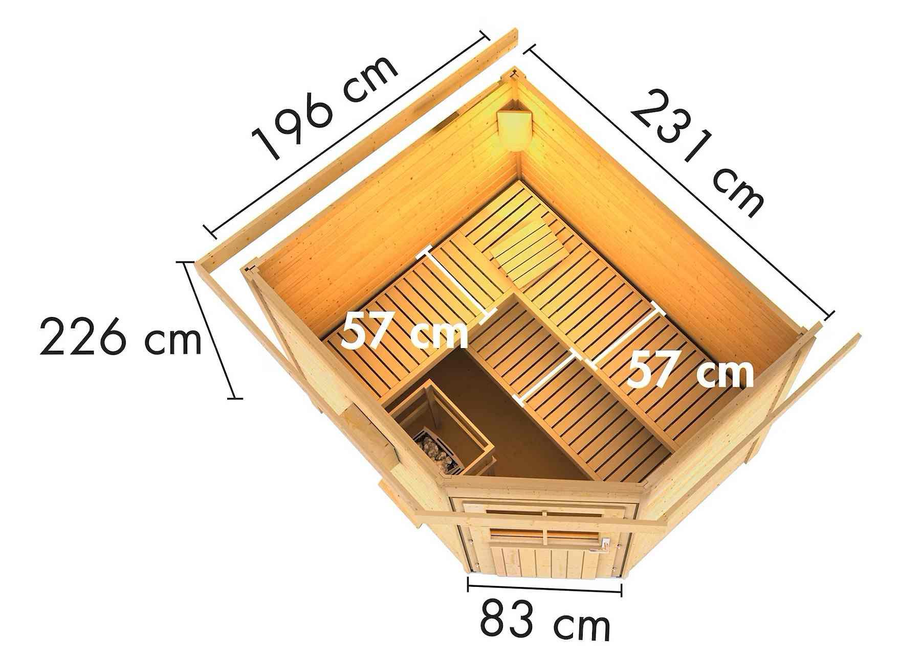Venkovní model finské sauny pro vaši zahradu. Sauna je určená pro 3 ležící osoby. Moderní design s chromovými rohovými lištami. Její výrobce, firma KARIBU HOLZTECHNIK z německých Brém, dokázala svými výrobky úspěšně navázat na staletou tradici skandinávského saunování a současně do ní zapracovat dnešní moderní technologie. Dodáváme jako stavebnici v rozloženém stavu, kde stěny tvoří jednotlivé dřevěné profily, které pouze sesadíte k sobě a sešroubujete, střechu tvoří celistvá deska. To garantuje jednoduchou montáž, kterou zvládne každý domácí kutil. Stěny sauny jsou složeny ze speciálně hlazených prken s dvojitým perem a drážkou, což garantuje neobyčejnou pevnost spoje. Aby teplo z vnitřních prostor sauny nemohlo unikat, je instalován druhý strop z rámové konstrukce s minerální izolační vatou o tloušťce 42 mm.
