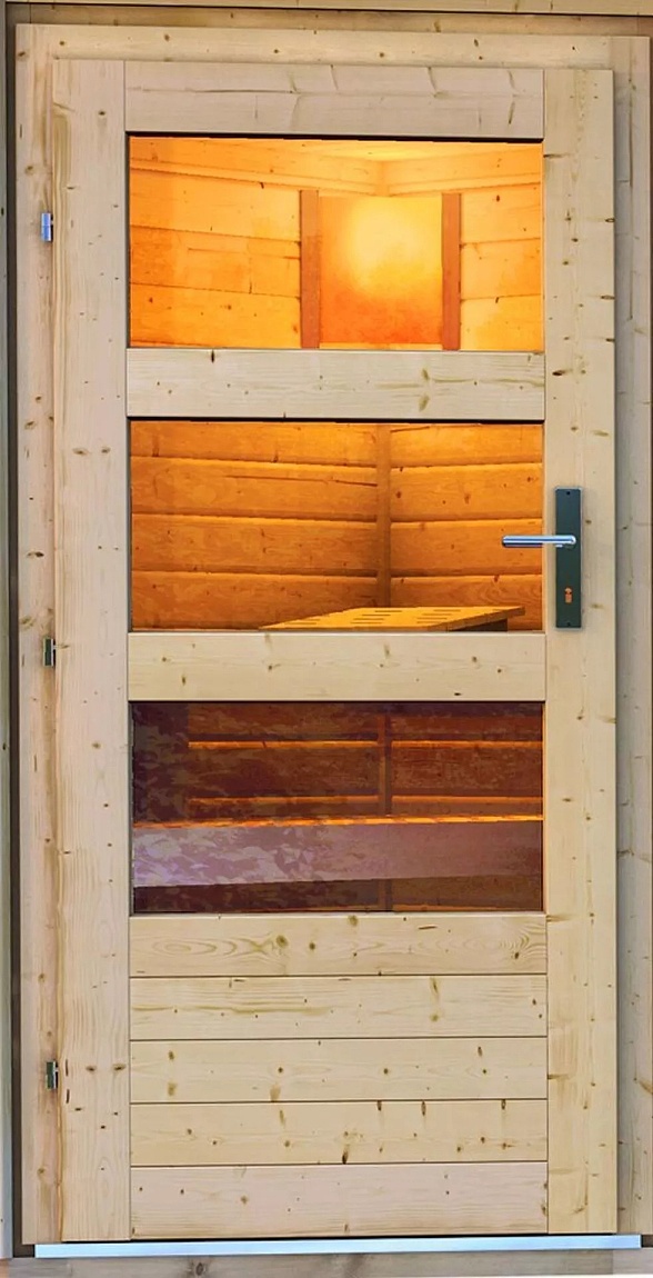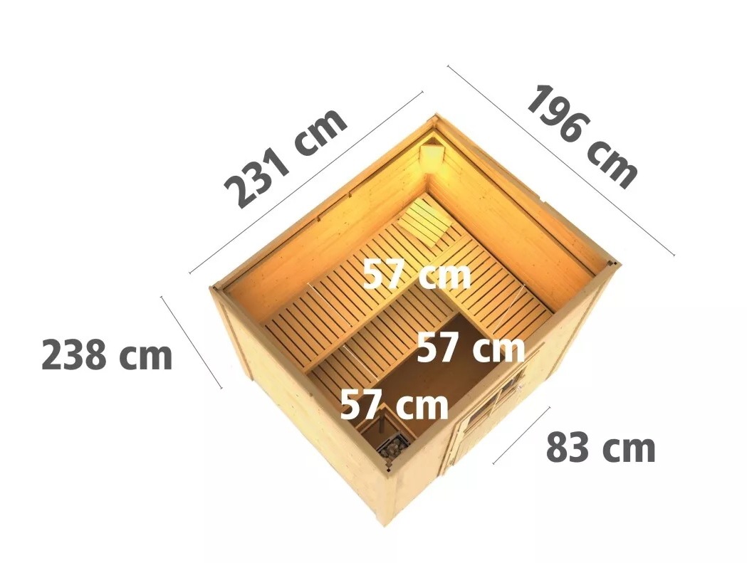 Venkovní model finské sauny pro vaši zahradu. Sauna je určená pro 3 ležící osoby. Moderní design s chromovými rohovými lištami. Její výrobce, firma KARIBU HOLZTECHNIK z německých Brém, dokázala svými výrobky úspěšně navázat na staletou tradici skandinávského saunování a současně do ní zapracovat dnešní moderní technologie. Dodáváme jako stavebnici v rozloženém stavu, kde stěny tvoří jednotlivé dřevěné profily, které pouze sesadíte k sobě a sešroubujete, střechu tvoří celistvá deska. To garantuje jednoduchou montáž, kterou zvládne každý domácí kutil. Stěny sauny jsou složeny ze speciálně hlazených prken s dvojitým perem a drážkou, což garantuje neobyčejnou pevnost spoje. Aby teplo z vnitřních prostor sauny nemohlo unikat, je instalován druhý strop z rámové konstrukce s minerální izolační vatou o tloušťce 42 mm.