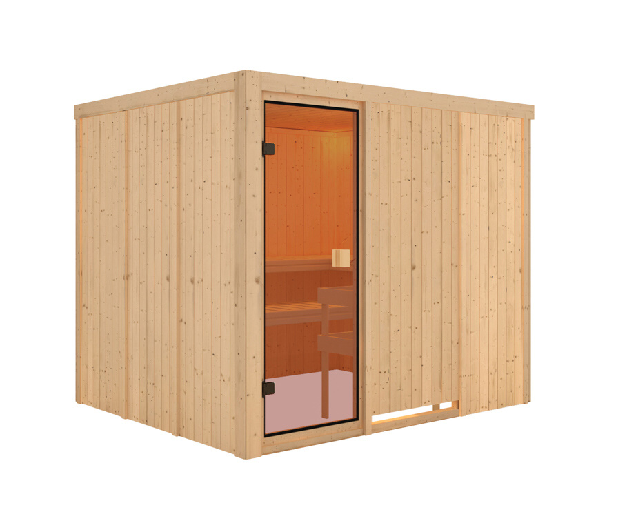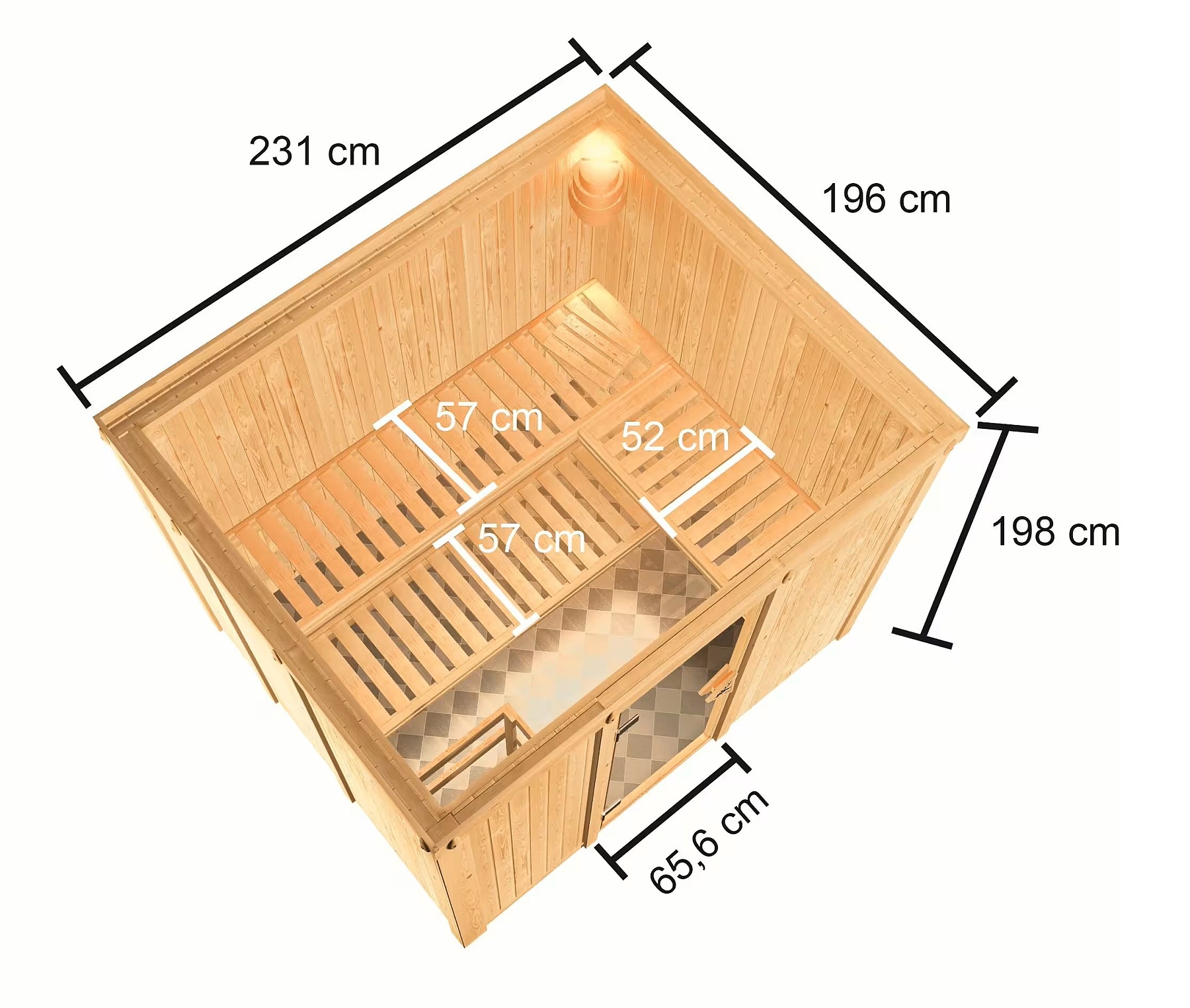 Finská sauna určená pro tři ležící osoby. Má rozměry š 231 x h 196 x v 198 cm. Tento model finské sauny je určený do temperovaných interiérů domu nebo bytu. Její výrobce, firma KARIBU HOLZTECHNIK z německých Brém, dokázala svými výrobky úspěšně navázat na staletou tradici skandinávského saunování a současně do ní zapracovat dnešní moderní technologie. Sauna je celá vyrobena ze dřeva severského smrku v přírodním provedení. Dřevo pochází ze vzdáleného severu Evropy a je chemicky naprosto neošetřené (není ani namořeno ani nalakováno). V důsledku toho je prosté všech známých problematických látek, které by se v průběhu saunování mohly ze dřeva uvolňovat. Tato interiérová sauna vykazuje mimořádné tepelně-izolační vlastnosti. Stěny sauny jsou složeny z vnitřní a vnější vrstvy speciálně hlazených prken s perem a drážkou, mezi kterými je 42 mm silná tepelná izolace v podobě minerální vlny. Celková síla stěny je tak 68 mm. Zadní nebo boční nepohledové strany orientované ke stěně místnosti mají vnější stranu ze sololitu. Proto jsou při stejné tepelné izolaci o cca 10 mm tenčí než pohledové strany pokryté palubkami.