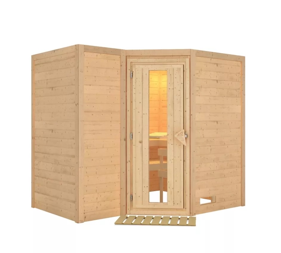 Finská sauna určená pro tři ležící osoby. Má rozměr š 264 x h 198 x v 213 cm. Tento model finské sauny je určený do temperovaných interiérů domu nebo bytu. Její výrobce, firma KARIBU HOLZTECHNIK z německých Brém, dokázala svými výrobky úspěšně navázat na staletou tradici skandinávského saunování a současně do ní zapracovat dnešní moderní technologie. Sauna je celá vyrobena ze dřeva severského smrku v přírodním provedení. Dřevo pochází ze vzdáleného severu Evropy a je chemicky naprosto neošetřené (není ani namořeno ani nalakováno). V důsledku toho je prosté všech známých problematických látek, které by se v průběhu saunování mohly ze dřeva uvolňovat. Tato interiérová sauna je vyrobena z masivního dřeva síly 40 mm. Stěny sauny jsou složeny ze speciálně hlazených prken s dvojitým perem a drážkou, což garantuje neobyčejnou pevnost spoje.