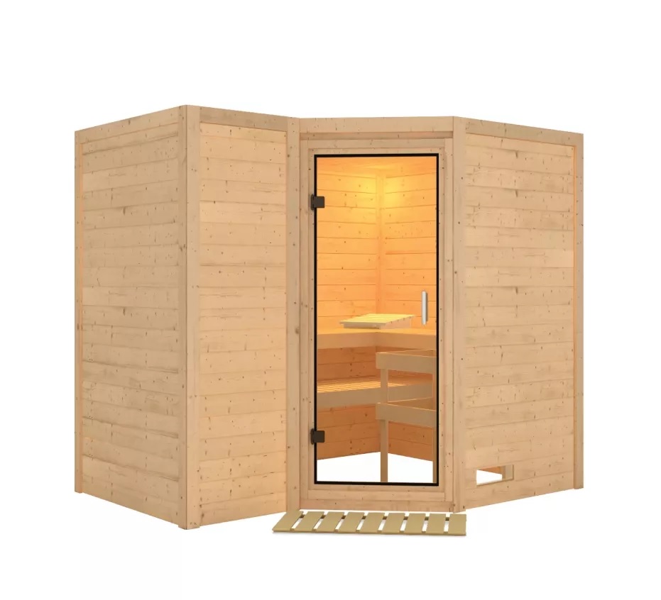 Finská sauna určená pro tři ležící osoby. Má rozměr š 264 x h 198 x v 213 cm. Tento model finské sauny je určený do temperovaných interiérů domu nebo bytu. Její výrobce, firma KARIBU HOLZTECHNIK z německých Brém, dokázala svými výrobky úspěšně navázat na staletou tradici skandinávského saunování a současně do ní zapracovat dnešní moderní technologie. Sauna je celá vyrobena ze dřeva severského smrku v přírodním provedení. Dřevo pochází ze vzdáleného severu Evropy a je chemicky naprosto neošetřené (není ani namořeno ani nalakováno). V důsledku toho je prosté všech známých problematických látek, které by se v průběhu saunování mohly ze dřeva uvolňovat. Tato interiérová sauna je vyrobena z masivního dřeva síly 40 mm. Stěny sauny jsou složeny ze speciálně hlazených prken s dvojitým perem a drážkou, což garantuje neobyčejnou pevnost spoje.