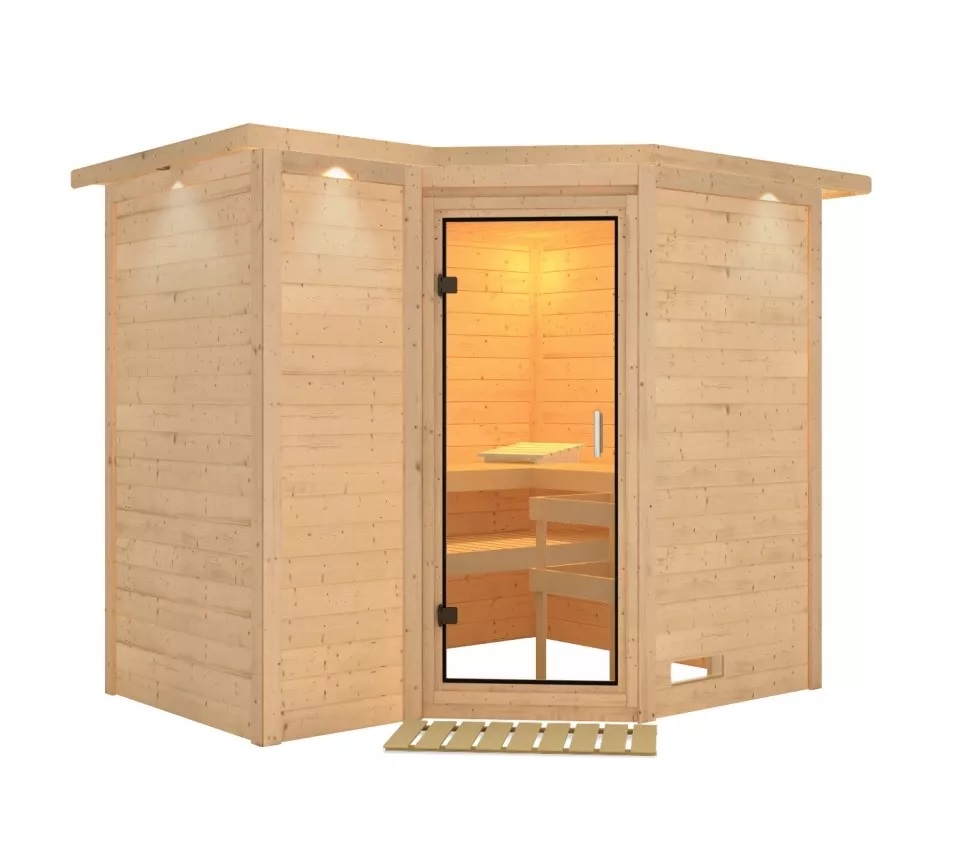 Finská sauna určená pro tři ležící osoby. Má rozměr š 264 x h 198 x v 213 cm. Tento model finské sauny je určený do temperovaných interiérů domu nebo bytu. Stropní římsa včetně 3 LED světel šikovně dotváří atmosféru sauny. Její výrobce, firma KARIBU HOLZTECHNIK z německých Brém, dokázala svými výrobky úspěšně navázat na staletou tradici skandinávského saunování a současně do ní zapracovat dnešní moderní technologie. Sauna je celá vyrobena ze dřeva severského smrku v přírodním provedení. Dřevo pochází ze vzdáleného severu Evropy a je chemicky naprosto neošetřené (není ani namořeno ani nalakováno). V důsledku toho je prosté všech známých problematických látek, které by se v průběhu saunování mohly ze dřeva uvolňovat. Tato interiérová sauna je vyrobena z masivního dřeva síly 40 mm. Stěny sauny jsou složeny ze speciálně hlazených prken s dvojitým perem a drážkou, což garantuje neobyčejnou pevnost spoje.