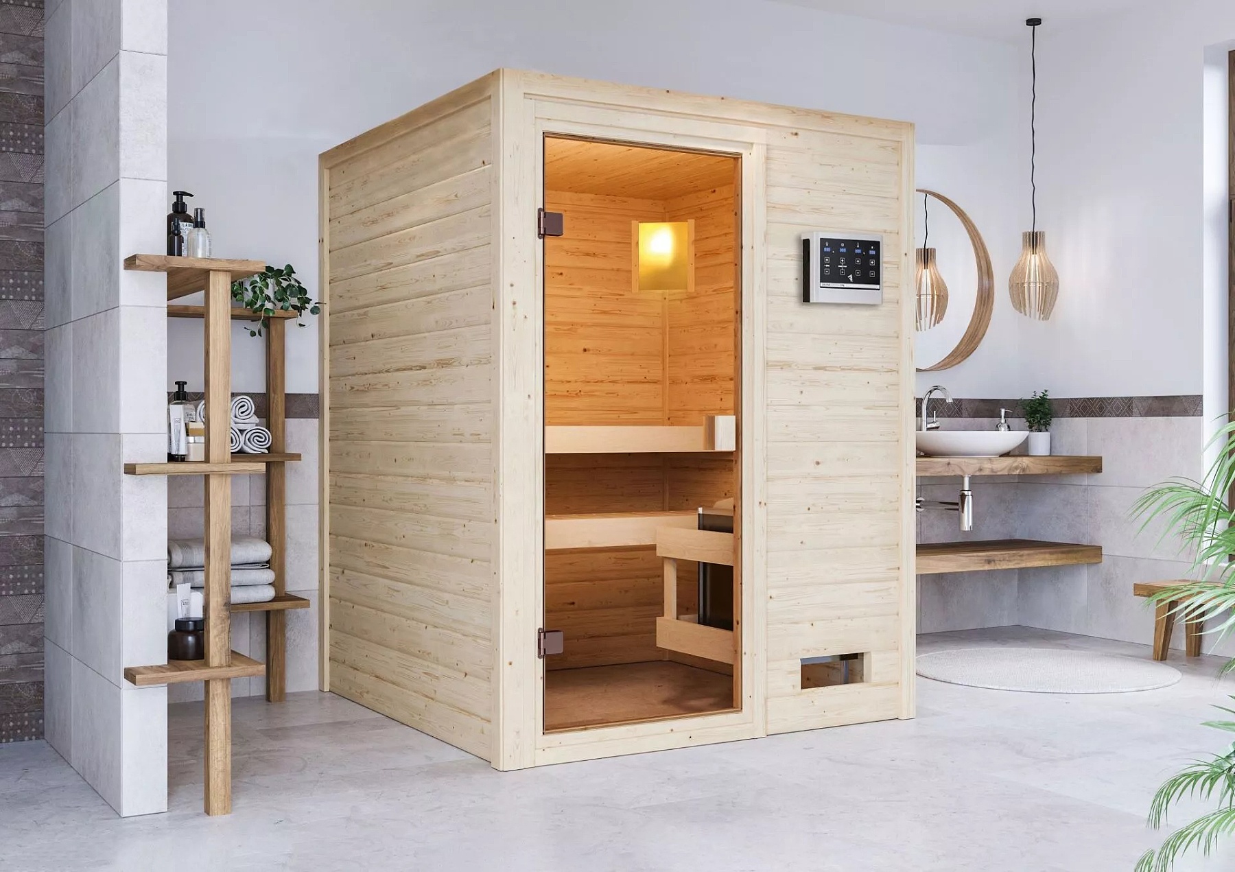 Tento model finské sauny je určený do temperovaných interiérů domu nebo bytu. Finská sauna určená pro dvě ležící osoby. Čtvercové rozměry š 145 x h 145 x v 187 cm. Její výrobce, firma KARIBU HOLZTECHNIK z německých Brém, dokázala svými výrobky úspěšně navázat na staletou tradici skandinávského saunování a současně do ní zapracovat dnešní moderní technologie. Sauna je celá vyrobena ze dřeva severského smrku v přírodním provedení. Dřevo pochází ze vzdáleného severu Evropy a je chemicky naprosto neošetřené (není ani namořeno ani nalakováno). V důsledku toho je prosté všech známých problematických látek, které by se v průběhu saunování mohly ze dřeva uvolňovat. Tato interiérová sauna je vyrobena z masivního dřeva síly 38 mm. Stěny sauny jsou složeny ze speciálně hlazených prken s dvojitým perem a drážkou, což garantuje neobyčejnou pevnost spoje.