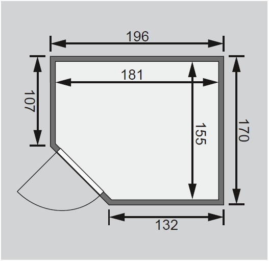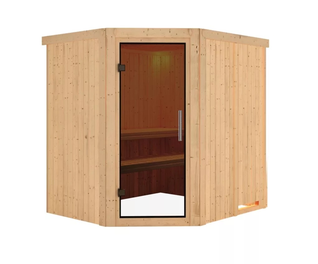 Finská sauna je určená pro dvě ležící osoby. Má rozměr š 196 x h 170 x v 198 cm s rohovými dveřmi. Tento model finské sauny je určený do temperovaných interiérů domu nebo bytu. Její výrobce, firma KARIBU HOLZTECHNIK z německých Brém, dokázala svými výrobky úspěšně navázat na staletou tradici skandinávského saunování a současně do ní zapracovat dnešní moderní technologie. Sauna je celá vyrobena ze dřeva severského smrku v přírodním provedení. Dřevo pochází ze vzdáleného severu Evropy a je chemicky naprosto neošetřené (není ani namořeno ani nalakováno). V důsledku toho je prosté všech známých problematických látek, které by se v průběhu saunování mohly ze dřeva uvolňovat. Tato interiérová sauna vykazuje mimořádné tepelně-izolační vlastnosti. Stěny sauny jsou složeny z vnitřní a vnější vrstvy speciálně hlazených prken s perem a drážkou, mezi kterými je 42 mm silná tepelná izolace v podobě minerální vlny. Celková síla stěny je tak 68 mm. Zadní nebo boční nepohledové strany orientované ke stěně místnosti mají vnější stranu ze sololitu. Proto jsou při stejné tepelné izolaci o cca 10 mm tenčí než pohledové strany pokryté palubkami.