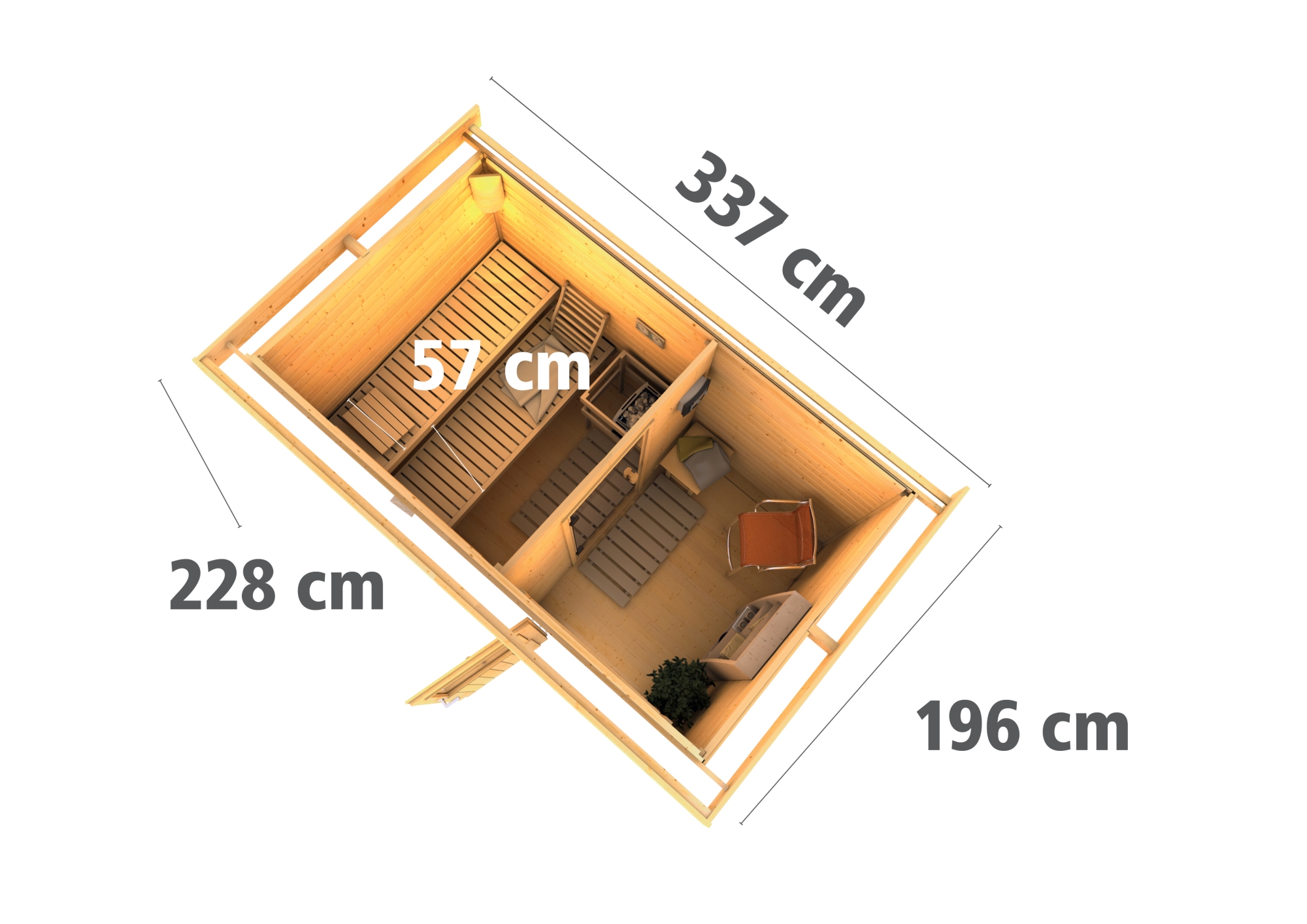 Venkovní model finské sauny pro vaši zahradu. Sauna je určená pro 2 ležící osoby. Moderní design s chromovými rohovými lištami. Její výrobce, firma KARIBU HOLZTECHNIK z německých Brém, dokázala svými výrobky úspěšně navázat na staletou tradici skandinávského saunování a současně do ní zapracovat dnešní moderní technologie. Dodáváme jako stavebnici v rozloženém stavu, kde stěny tvoří jednotlivé dřevěné profily, které pouze sesadíte k sobě a sešroubujete, střechu tvoří celistvá deska. To garantuje jednoduchou montáž, kterou zvládne každý domácí kutil. Stěny sauny jsou složeny ze speciálně hlazených prken s dvojitým perem a drážkou, což garantuje neobyčejnou pevnost spoje. Aby teplo z vnitřních prostor sauny nemohlo unikat, je instalován druhý strop z rámové konstrukce s minerální izolační vatou o tloušťce 42 mm.