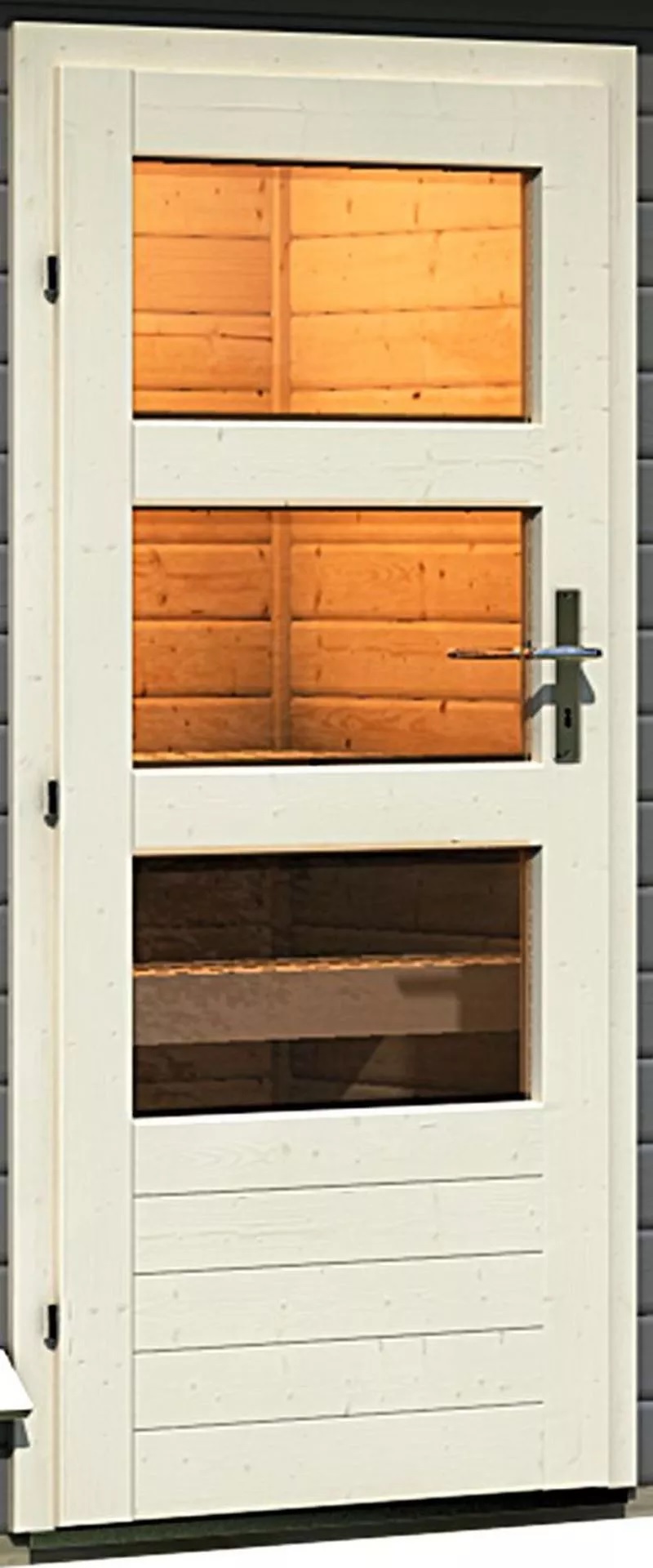 Venkovní model finské sauny pro vaši zahradu. Sauna je určená pro 2 ležící osoby. Moderní design s chromovými rohovými lištami. Její výrobce, firma KARIBU HOLZTECHNIK z německých Brém, dokázala svými výrobky úspěšně navázat na staletou tradici skandinávského saunování a současně do ní zapracovat dnešní moderní technologie. Dodáváme jako stavebnici v rozloženém stavu, kde stěny tvoří jednotlivé dřevěné profily, které pouze sesadíte k sobě a sešroubujete, střechu tvoří celistvá deska. To garantuje jednoduchou montáž, kterou zvládne každý domácí kutil. Stěny sauny jsou složeny ze speciálně hlazených prken s dvojitým perem a drážkou, což garantuje neobyčejnou pevnost spoje. Aby teplo z vnitřních prostor sauny nemohlo unikat, je instalován druhý strop z rámové konstrukce s minerální izolační vatou o tloušťce 42 mm.