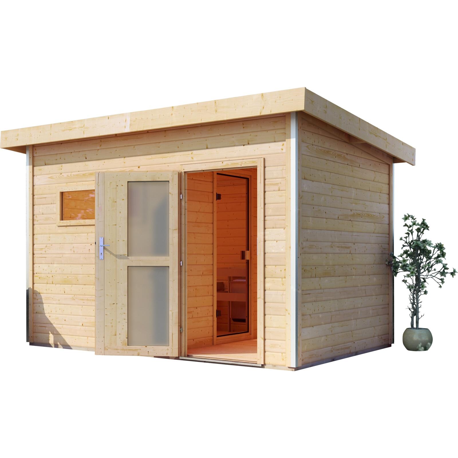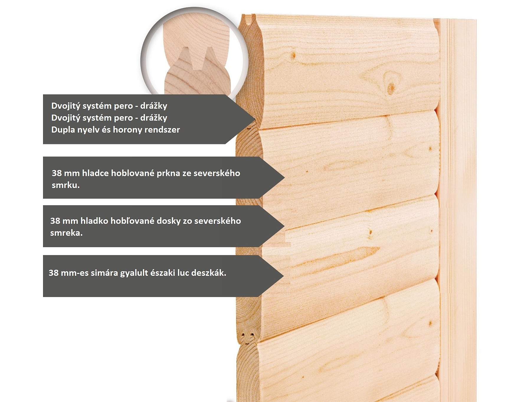 Venkovní model finské sauny pro vaši zahradu. Sauna je určená pro 3 ležící osoby. Moderní design s chromovými rohovými lištami. Její výrobce, firma KARIBU HOLZTECHNIK z německých Brém, dokázala svými výrobky úspěšně navázat na staletou tradici skandinávského saunování a současně do ní zapracovat dnešní moderní technologie. Dodáváme jako stavebnici v rozloženém stavu, kde stěny tvoří jednotlivé dřevěné profily, které pouze sesadíte k sobě a sešroubujete, střechu tvoří celistvá deska. To garantuje jednoduchou montáž, kterou zvládne každý domácí kutil. Stěny sauny jsou složeny ze speciálně hlazených prken s dvojitým perem a drážkou, což garantuje neobyčejnou pevnost spoje. Aby teplo z vnitřních prostor sauny nemohlo unikat, je instalován druhý strop z rámové konstrukce s minerální izolační vatou o tloušťce 42 mm.