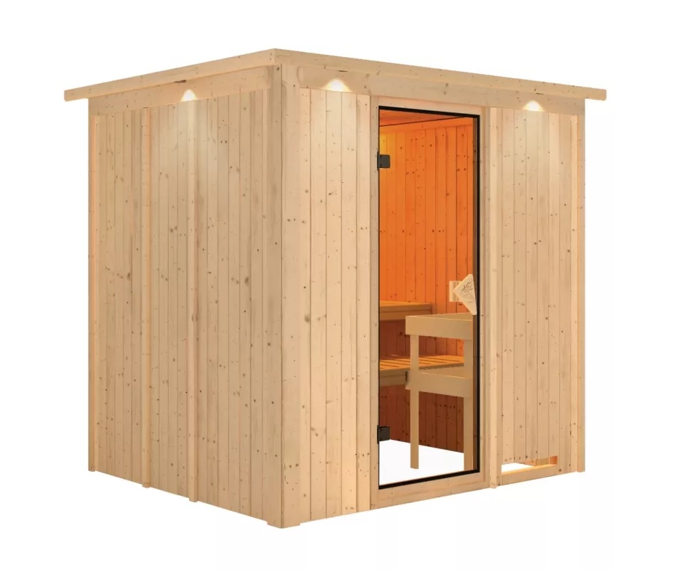 Finská sauna určená pro dvě ležící osoby. Má obdélníkový tvar š 196 x h 170 x v 198 cm. Tento model finské sauny je určený do temperovaných interiérů domu nebo bytu. Její výrobce, firma KARIBU HOLZTECHNIK z německých Brém, dokázala svými výrobky úspěšně navázat na staletou tradici skandinávského saunování a současně do ní zapracovat dnešní moderní technologie. Sauna je celá vyrobena ze dřeva severského smrku v přírodním provedení. Dřevo pochází ze vzdáleného severu Evropy a je chemicky naprosto neošetřené (není ani namořeno ani nalakováno). V důsledku toho je prosté všech známých problematických látek, které by se v průběhu saunování mohly ze dřeva uvolňovat. Tato interiérová sauna vykazuje mimořádné tepelně-izolační vlastnosti. Stěny sauny jsou složeny z vnitřní a vnější vrstvy speciálně hlazených prken s perem a drážkou, mezi kterými je 42 mm silná tepelná izolace v podobě minerální vlny. Celková síla stěny je tak 68 mm. Zadní nebo boční nepohledové strany orientované ke stěně místnosti mají vnější stranu ze sololitu. Proto jsou při stejné tepelné izolaci o cca 10 mm tenčí než pohledové strany pokryté palubkami.