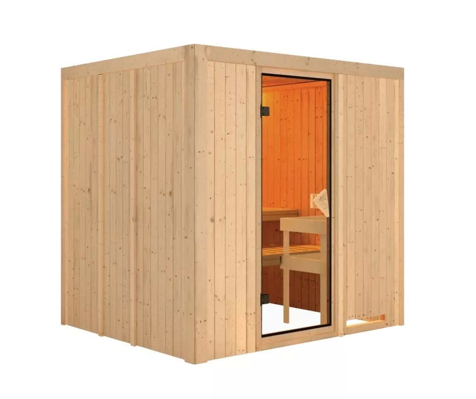 Finská sauna určená pro dvě ležící osoby. Má obdélníkový tvar š 196 x h 170 x v 198 cm. Tento model finské sauny je určený do temperovaných interiérů domu nebo bytu. Její výrobce, firma KARIBU HOLZTECHNIK z německých Brém, dokázala svými výrobky úspěšně navázat na staletou tradici skandinávského saunování a současně do ní zapracovat dnešní moderní technologie. Sauna je celá vyrobena ze dřeva severského smrku v přírodním provedení. Dřevo pochází ze vzdáleného severu Evropy a je chemicky naprosto neošetřené (není ani namořeno ani nalakováno). V důsledku toho je prosté všech známých problematických látek, které by se v průběhu saunování mohly ze dřeva uvolňovat. Tato interiérová sauna vykazuje mimořádné tepelně-izolační vlastnosti. Stěny sauny jsou složeny z vnitřní a vnější vrstvy speciálně hlazených prken s perem a drážkou, mezi kterými je 42 mm silná tepelná izolace v podobě minerální vlny. Celková síla stěny je tak 68 mm. Zadní nebo boční nepohledové strany orientované ke stěně místnosti mají vnější stranu ze sololitu. Proto jsou při stejné tepelné izolaci o cca 10 mm tenčí než pohledové strany pokryté palubkami.
