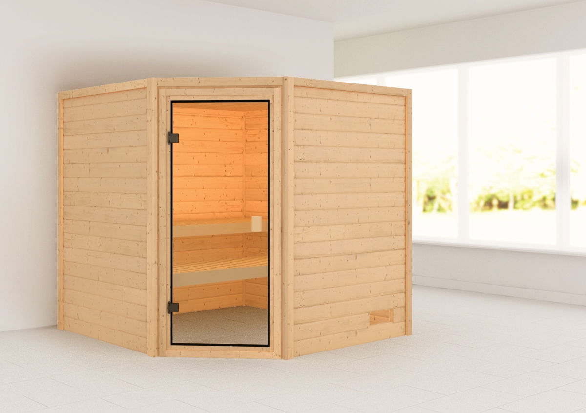 Finská sauna určená pro dvě ležící osoby. Má rozměr š 195 x h 195 x v 187 cm s rohovými dveřmi. Tento model finské sauny je určený do temperovaných interiérů domu nebo bytu. Její výrobce, firma KARIBU HOLZTECHNIK z německých Brém, dokázala svými výrobky úspěšně navázat na staletou tradici skandinávského saunování a současně do ní zapracovat dnešní moderní technologie. Sauna je celá vyrobena ze dřeva severského smrku v přírodním provedení. Dřevo pochází ze vzdáleného severu Evropy a je chemicky naprosto neošetřené (není ani namořeno ani nalakováno). V důsledku toho je prosté všech známých problematických látek, které by se v průběhu saunování mohly ze dřeva uvolňovat. Tato interiérová sauna je vyrobena z masivního dřeva síly 38 mm. Stěny sauny jsou složeny ze speciálně hlazených prken s dvojitým perem a drážkou, což garantuje neobyčejnou pevnost spoje.