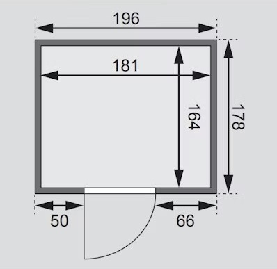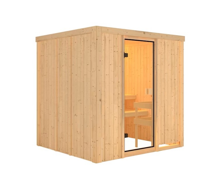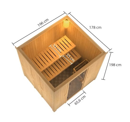 Finská sauna určená pro dvě ležící osoby. Má rozměry š 196 x h 178 x v 198 cm. Tento model finské sauny je určený do temperovaných interiérů domu nebo bytu. Její výrobce, firma KARIBU HOLZTECHNIK z německých Brém, dokázala svými výrobky úspěšně navázat na staletou tradici skandinávského saunování a současně do ní zapracovat dnešní moderní technologie. Sauna je celá vyrobena ze dřeva severského smrku v přírodním provedení. Dřevo pochází ze vzdáleného severu Evropy a je chemicky naprosto neošetřené (není ani namořeno ani nalakováno). V důsledku toho je prosté všech známých problematických látek, které by se v průběhu saunování mohly ze dřeva uvolňovat. Tato interiérová sauna vykazuje mimořádné tepelně-izolační vlastnosti. Stěny sauny jsou složeny z vnitřní a vnější vrstvy speciálně hlazených prken s perem a drážkou, mezi kterými je 42 mm silná tepelná izolace v podobě minerální vlny. Celková síla stěny je tak 68 mm. Zadní nebo boční nepohledové strany orientované ke stěně místnosti mají vnější stranu ze sololitu. Proto jsou při stejné tepelné izolaci o cca 10 mm tenčí než pohledové strany pokryté palubkami.
