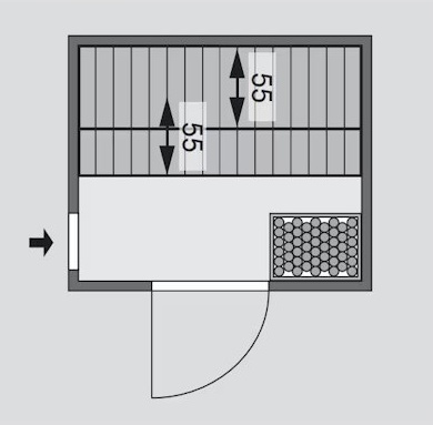 Sauna nemá vlastní podlahu a je nutné ji umístit výhradně v místnosti s odpovídající podlahovou krytinou, ideálně dlažbou. Saunu dodáváme ve verzi bez stropní římsy (profilu) u stropu, ve kterém může být instalováno dodatečné LED osvětlení.