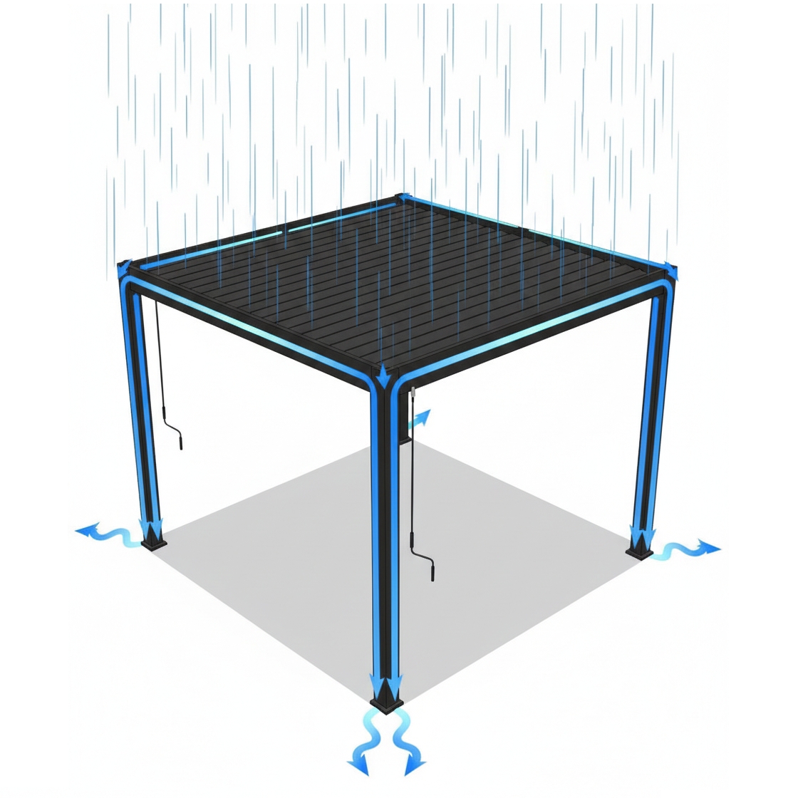 Primárním úkolem střešních lamel pergoly LANITPLAST BASIC je nastavení intenzity zastínění slunce, nicméně otočná střecha v zavřeném stavu zajistí i ochranu před deštěm. Při úplném uzavření střechy jsou totiž střešní lamely do sebe vzájemně zaklesnuty (systém pero drážka). Odvod vody je řešen jedinečným drenážním systémem integrovaným přímo do konstrukce. V zimním období je nutné ponechat lamely ve svislé otevřené poloze, jinak by mohlo dojít k jejich poškození.
