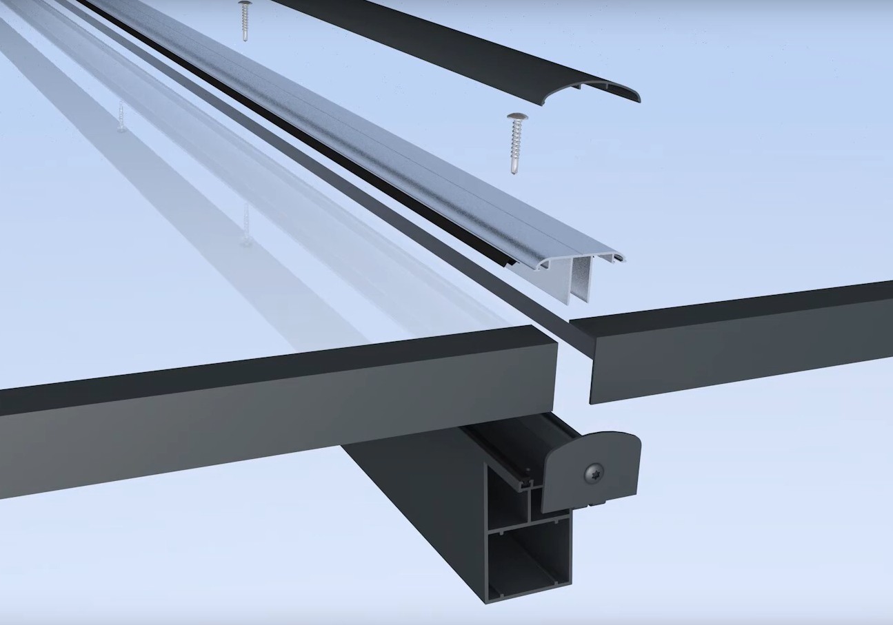 - polykarbonátové desky se připevňují pomocí přítlačné hliníkové lišty a šroubů, krycí lišty jsou v barvě pergoly