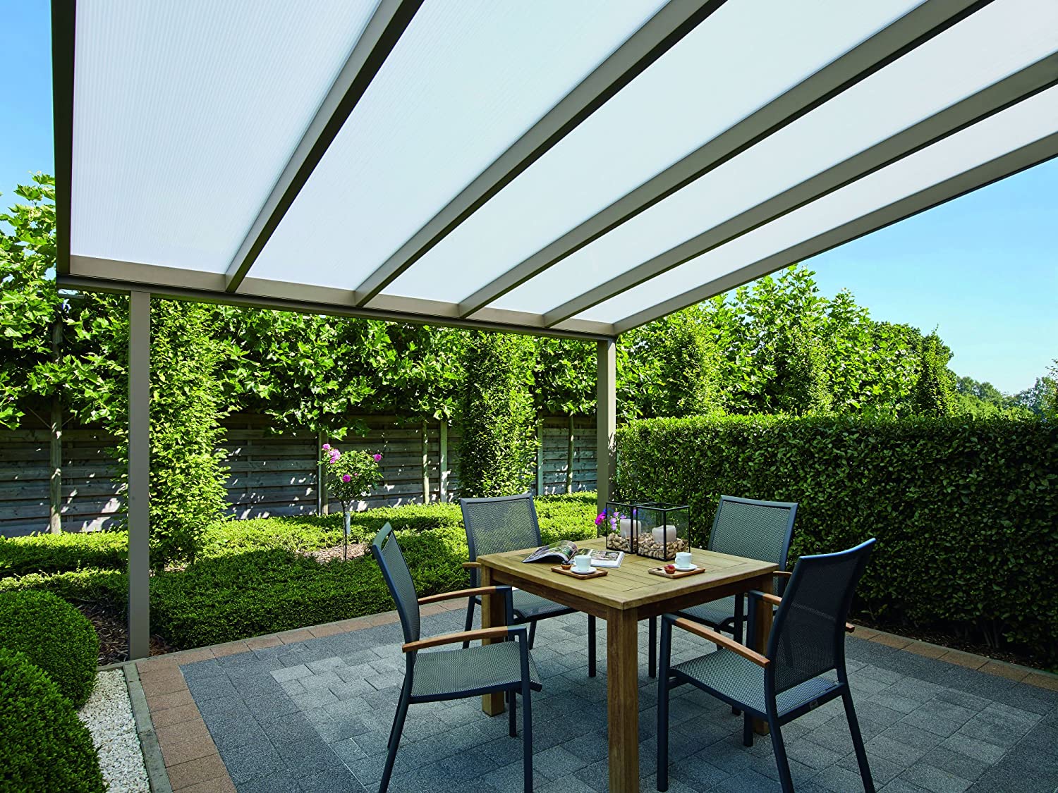 Polykarbonát - velmi kvalitní sedmistěnným polykarbonát se silným UV filtrem (na slunci a mrazu nekřehne, ani nežloutne). Z důvodu zajištění maximální kvality si prosklení sami vyrábíme z kvalitního polykarbonátu MARLON (výrobce Brett Martin Velká Británie). Polykarbonát je v ČR otestován státem akreditovanými zkušebnami jako stavební materiál. Na polykarbonát je poskytována smluvní záruka 10 let na nerozbitnost krupobitím (přesná specifikace záruky je obsažena v záručním listě).
