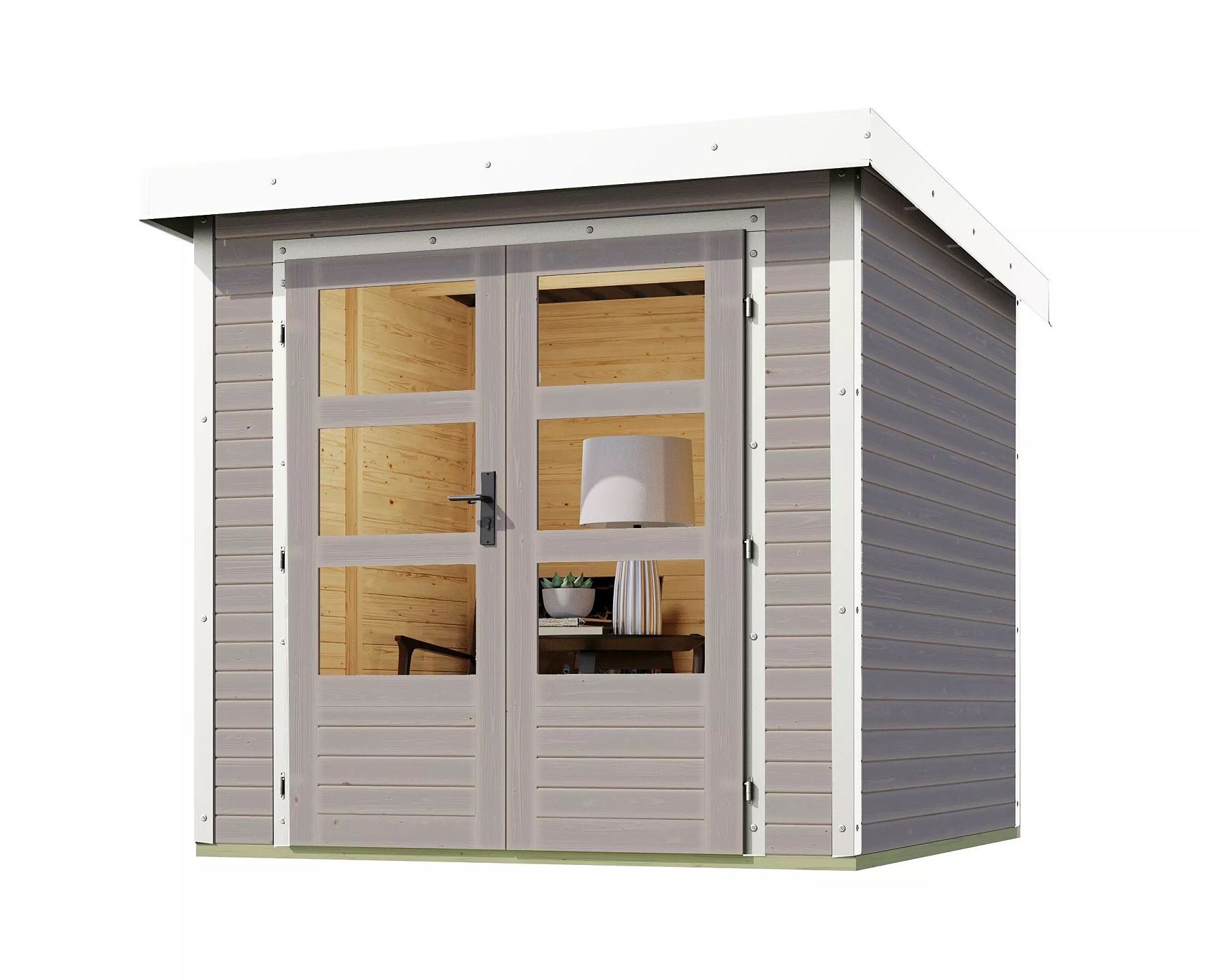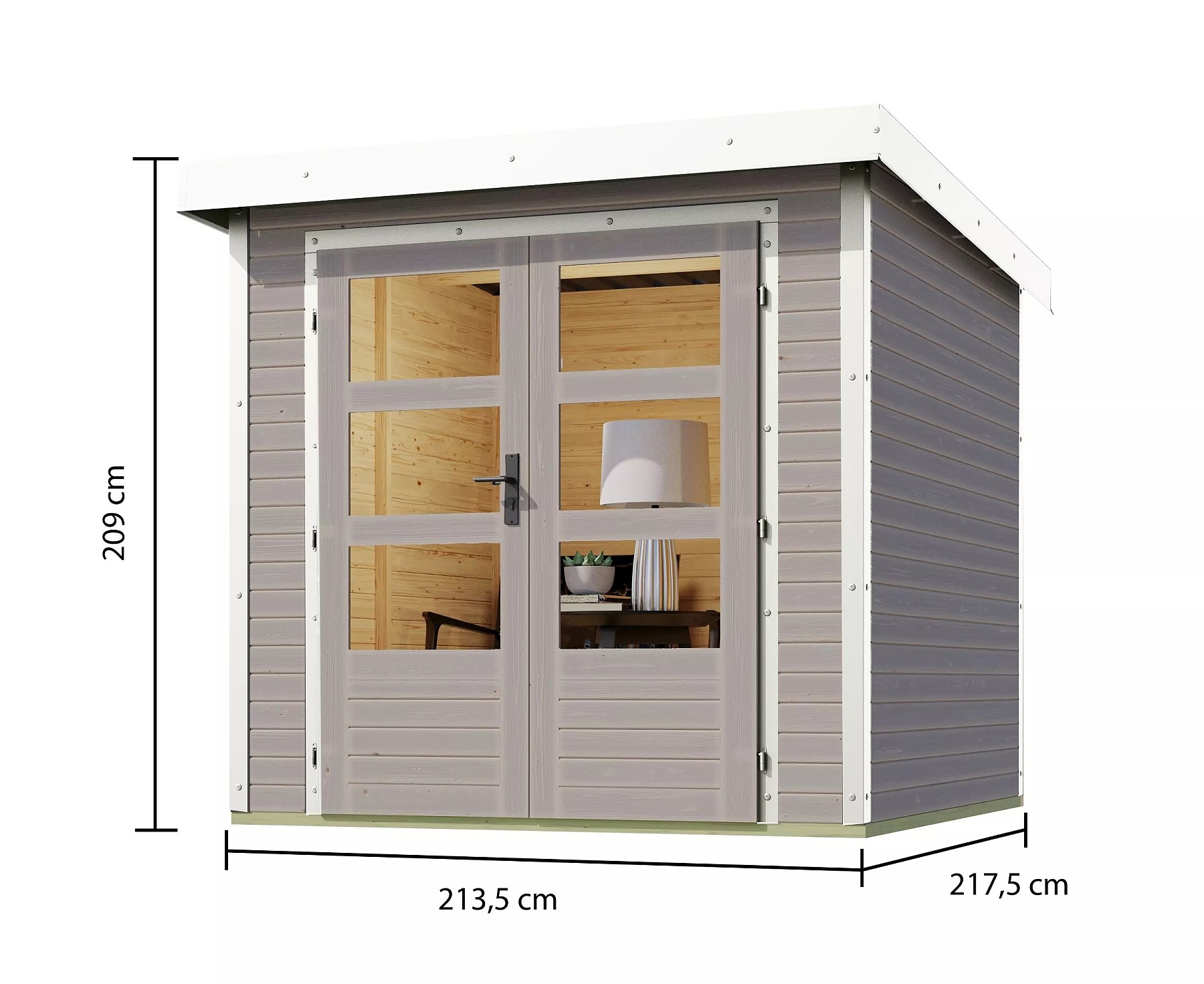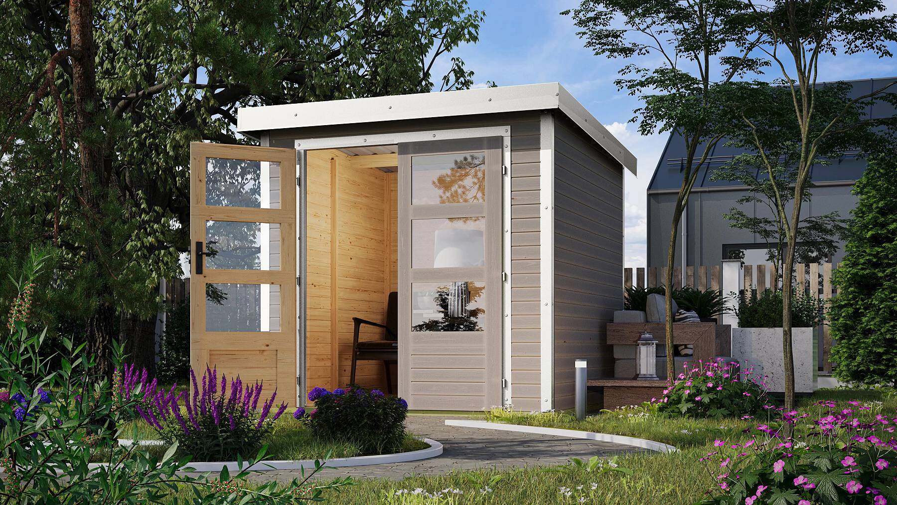 Tento model domku dodáváme v profesionálním nátěru KARIBU (odstín světle šedé RAL 360 60 05):