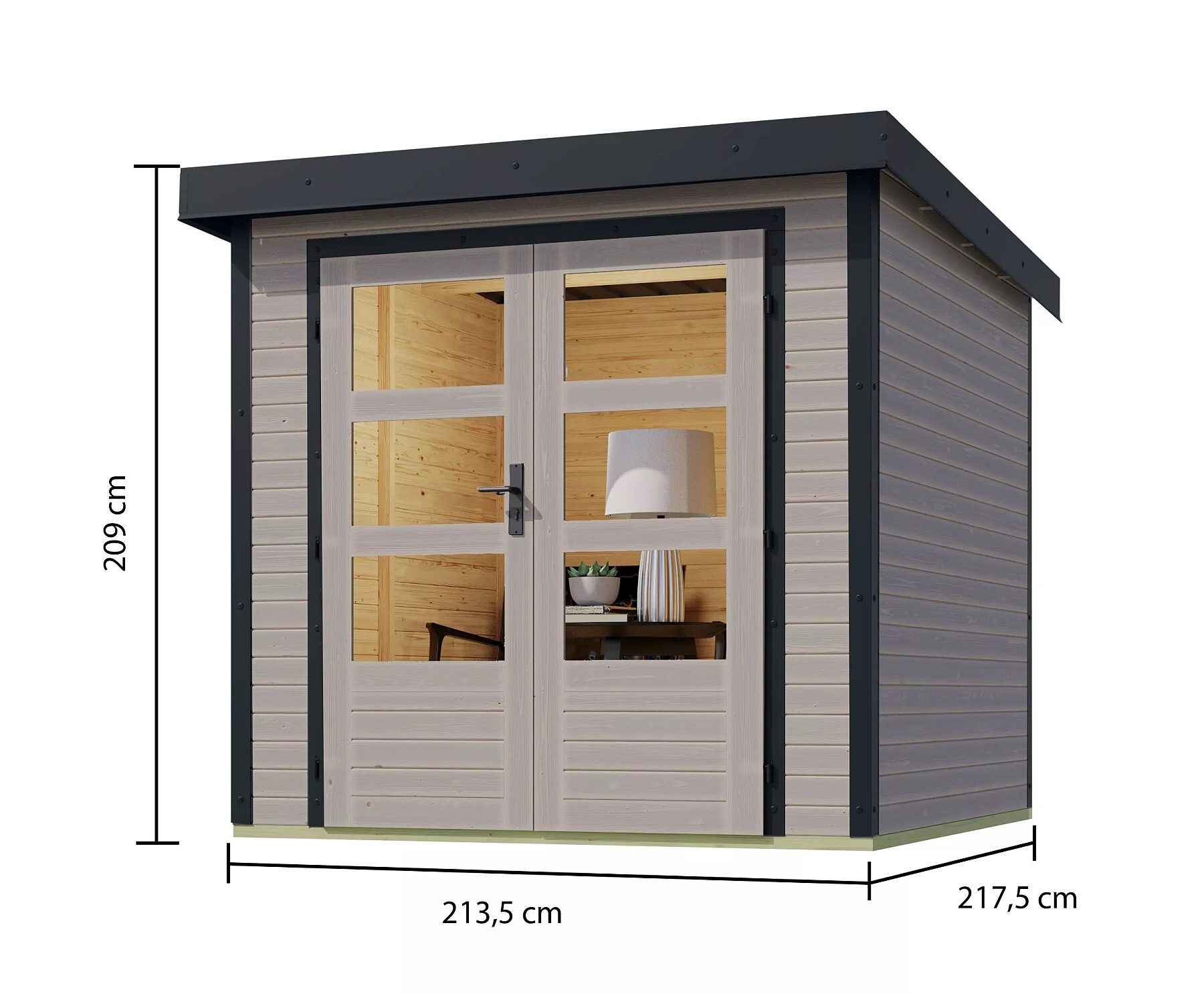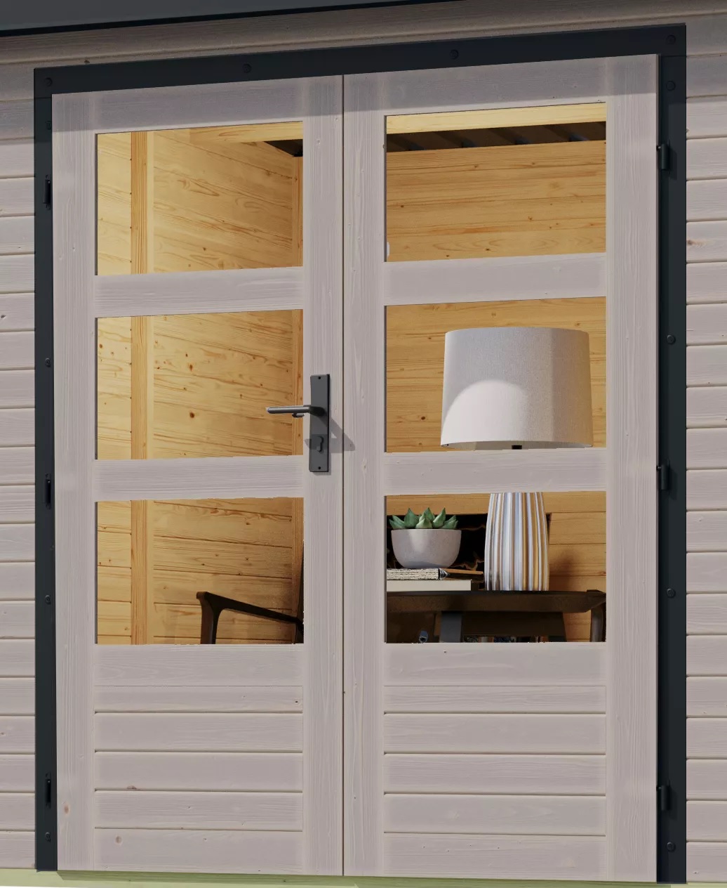 Tento model domku dodáváme v profesionálním nátěru KARIBU (odstín světle šedé RAL 360 60 05):