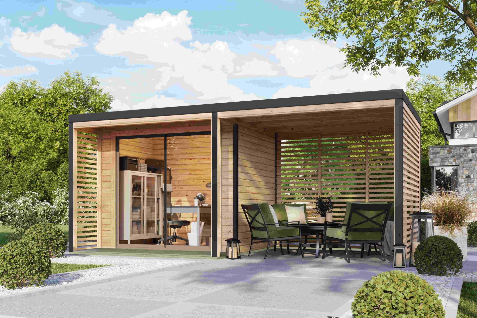 hybridní domek KARIBU SATURN (50563) natur / antracit + 253 cm přístavek včetně zadní a boční stěny