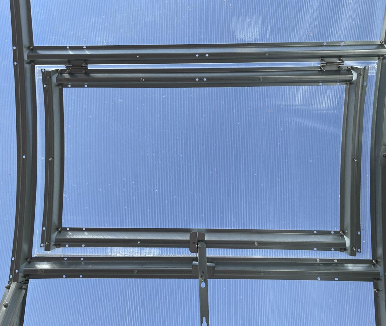 Jednokřídlé střešní ventilační okno o rozměru 0,60 x 0,95 m. Konstrukce okna je vyrobená z galvanicky pozinkovaných ocelových profilů síly 0,6 mm a šířky 55 mm. Jako prosklení střešního okna je využita vyříznutá polykarbonátová deska z pláště skleníku v místě umístění okna. Okno lze manuálně zajistit v poloze zavřeno nebo otevřeno. Doporučujeme přikoupení automatického otvírače z naší nabídky, výrazně tím zvýšíte a zjedodušíte komfort větrání. Automatický otvírač okno otevírá a zavírá v závislosti na okolní teplotě. Montujte vždy v souladu s montážním návodem.