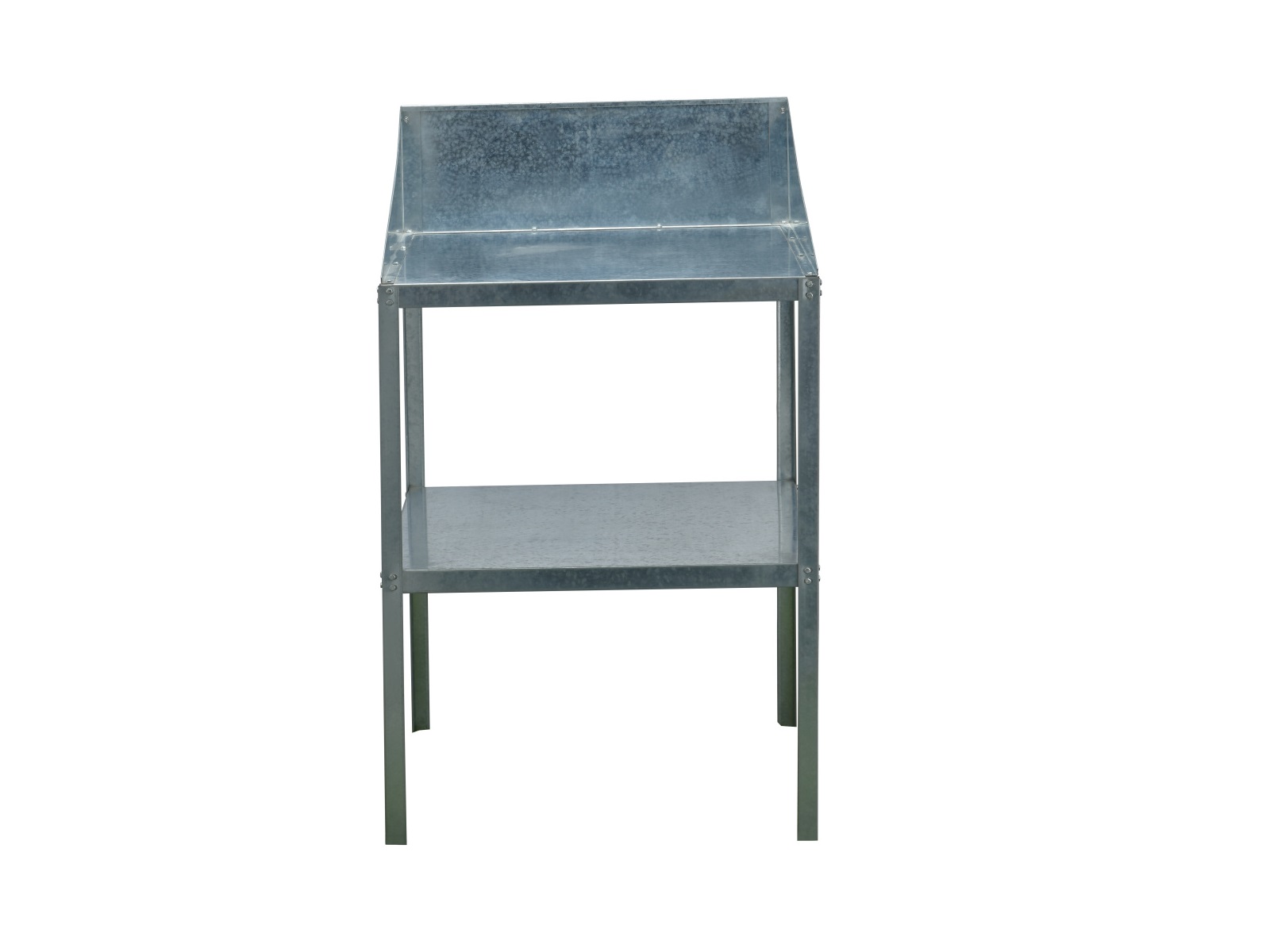 Ocelový dvoupolicový regál z pozinkovaného plechu stojící na zemi. Rozměry d 60 x š 60 x v 41 / 81 cm. Regál je vhodný pro skleníky všech typů. Univerzální produkt. Dodáváme v rozebraném stavu jako stavebnici.