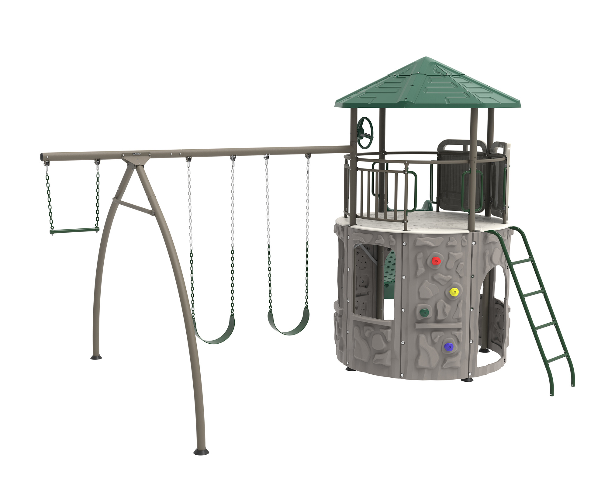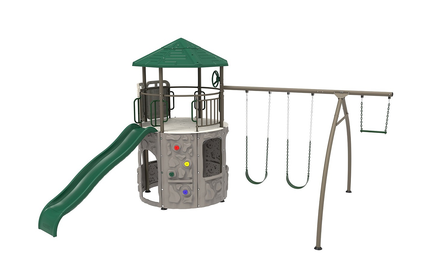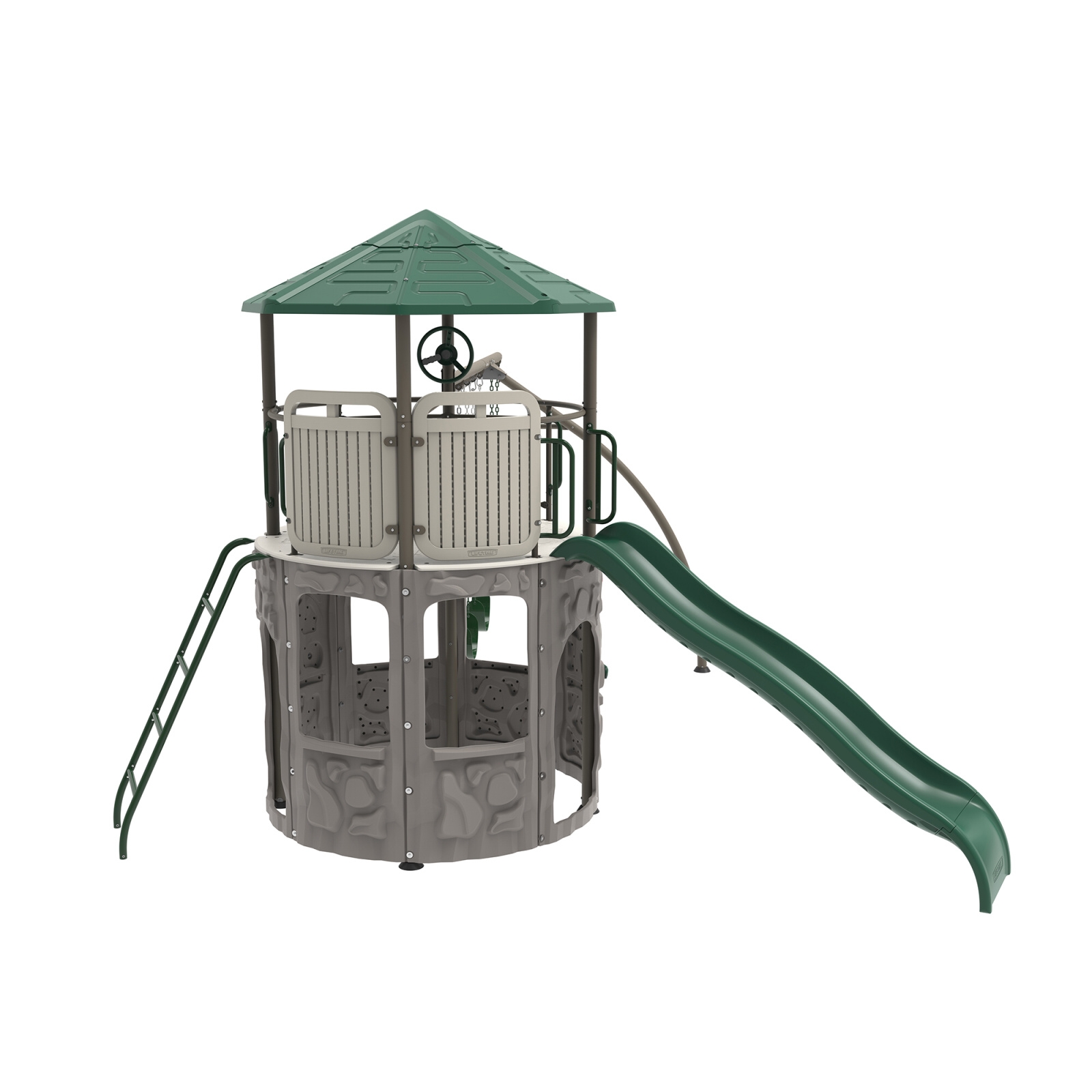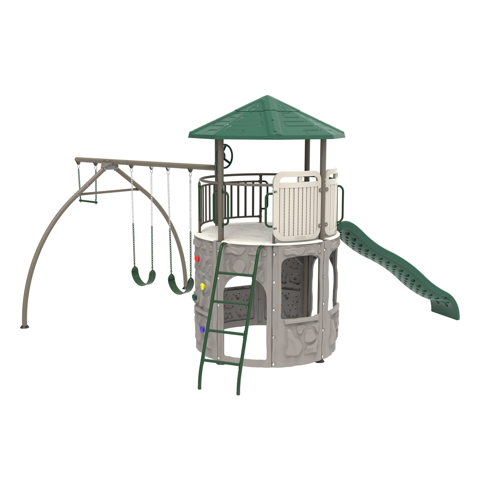Plastové dětské hřiště nové generace. Hřiště je složené z hrací věže o průměru 186 cm + skluzavka + 2 x houpačka + hrazda. Moderní design, snadná montáž, celoroční použití. Dětské hřiště má robustní ocelovou nosnou konstrukci. Stěny + střecha jsou vyrobeny z masivního velmi odolného a prakticky nerozbitného plastu s dvojitou stěnou síly 26 mm (PE-HD = extrémně odolný polyethylen s UV filtrem). Materiál hřiště na slunci a mrazu nežloutne ani nekřehne, takže odpadá pravidelné natírání, tak nezbytné u dřevěných hřišť. Toto plastové dětské hřiště je prakticky bezúdržbové. Hřiště je navrženo a vyrobeno tak, aby montáž byla co nejjednodušší a nejkratší. Jednotlivé díly pouze zaklapnete do sousedních dílů a spoj zajistíte šroubkem.