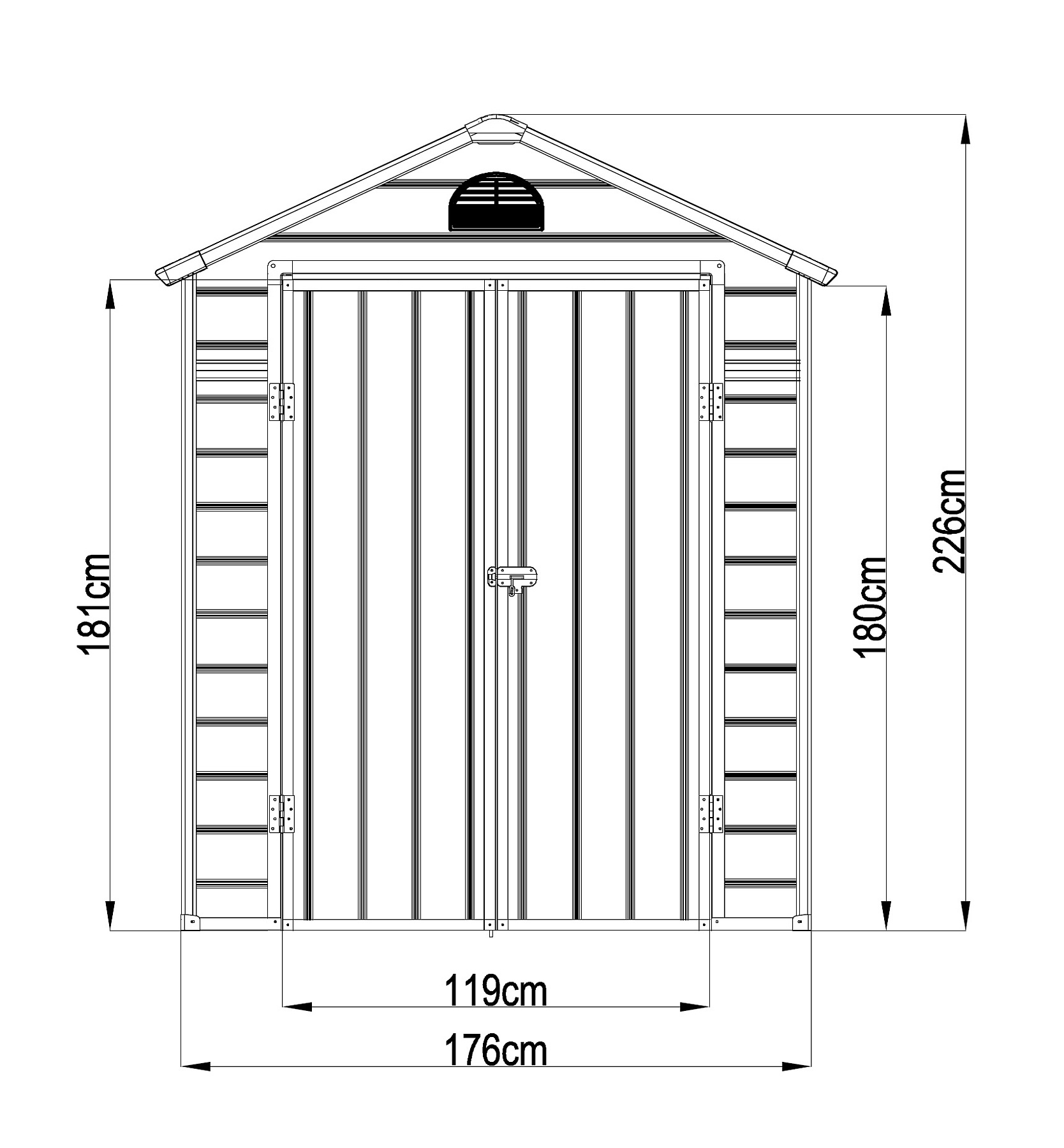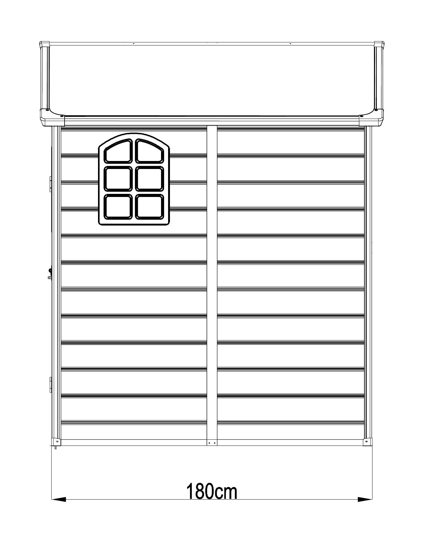 Velké dvoukřídlé vstupní dveře 119 x v 181 cm a boční okno (možno umístit na levou i pravou stranu) dodávají domku praktičnost a flexibilitu. Ventilační mřížka zajišťuje optimální odvětrávání a cirkulaci vzduchu uvnitř domku.