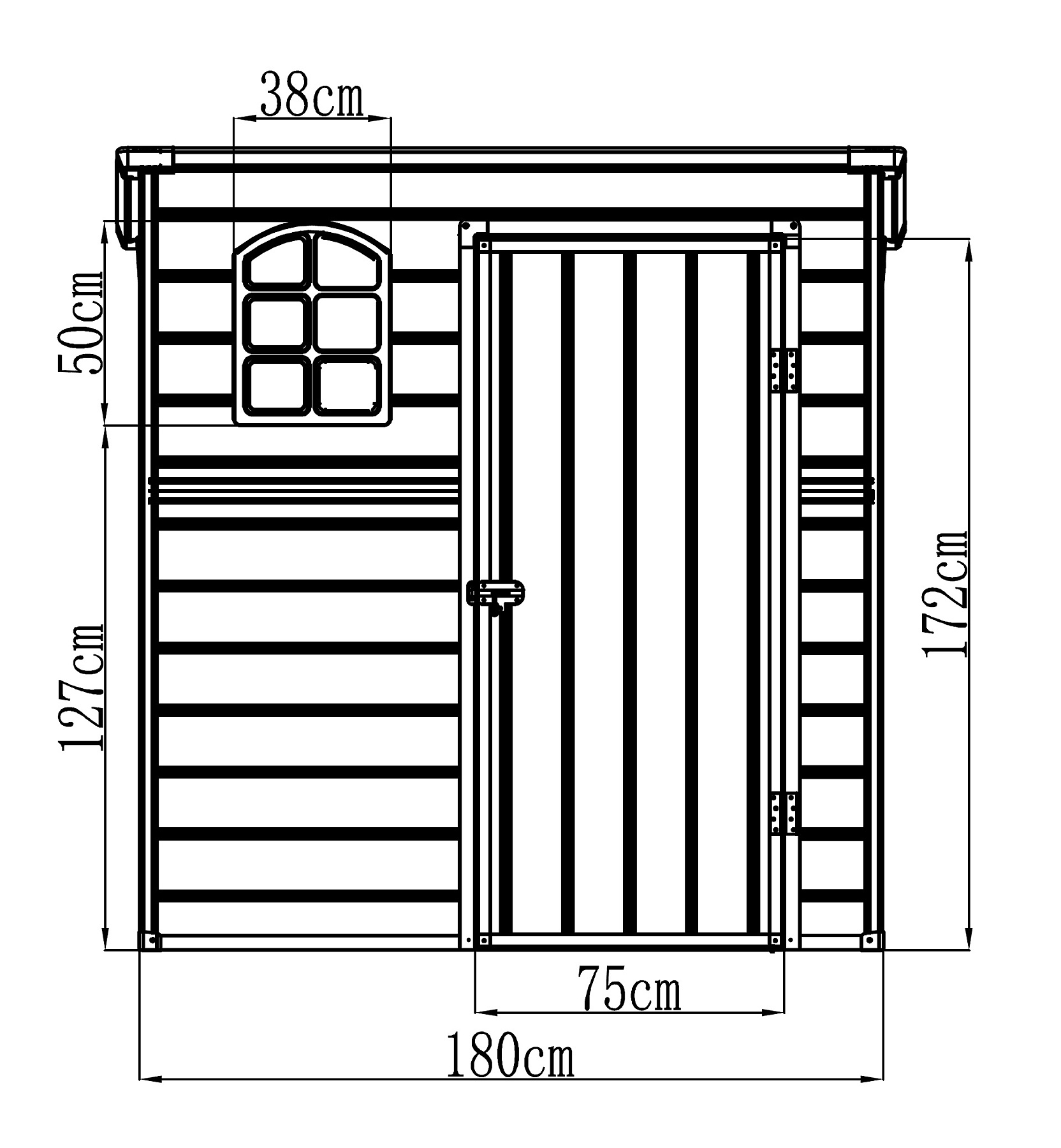 Jednokřídlé vstupní dveře 75 x v 172 cm dodávají domku praktičnost a flexibilitu. Ventilační mřížka zajišťuje optimální odvětrávání a cirkulaci vzduchu uvnitř domku.