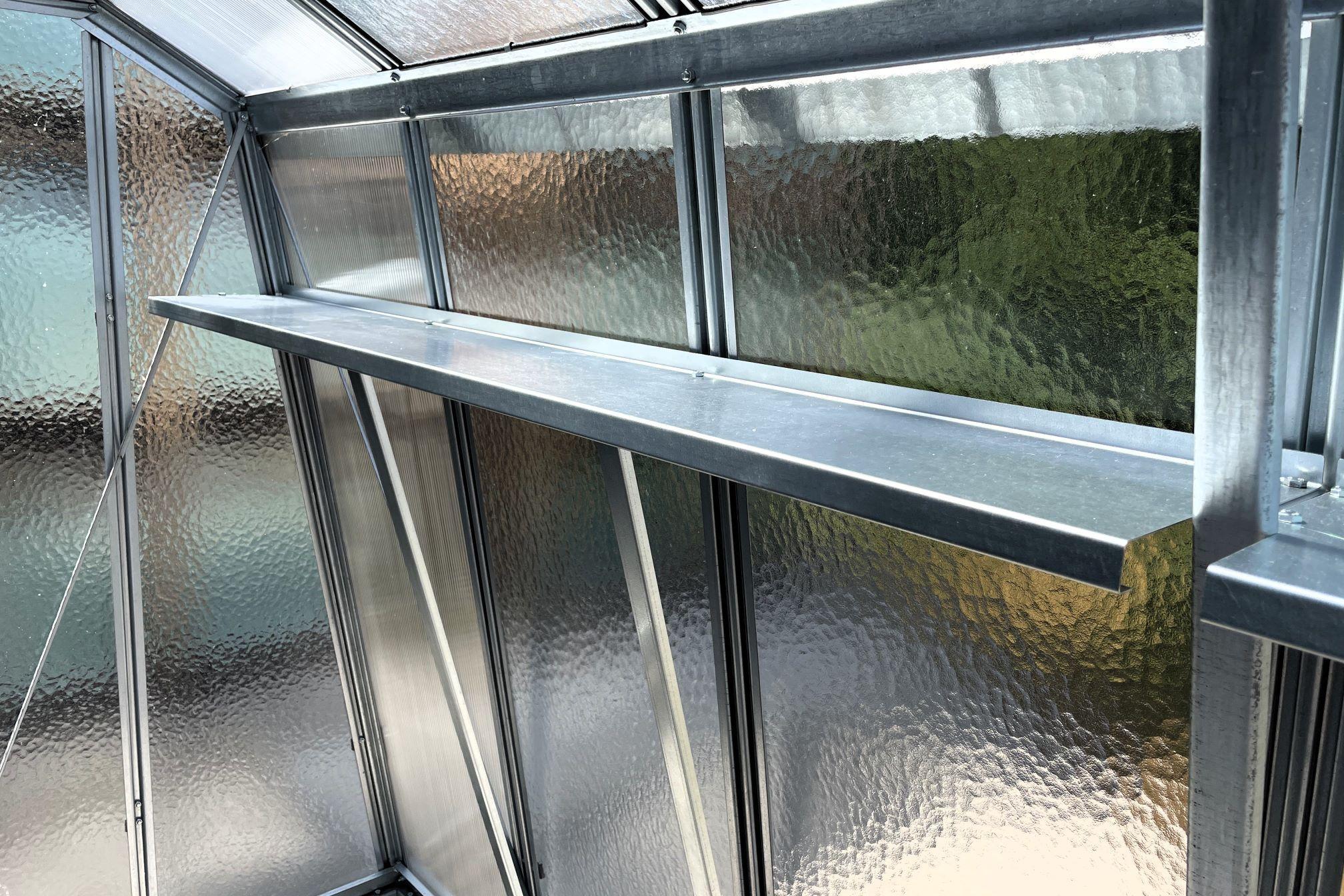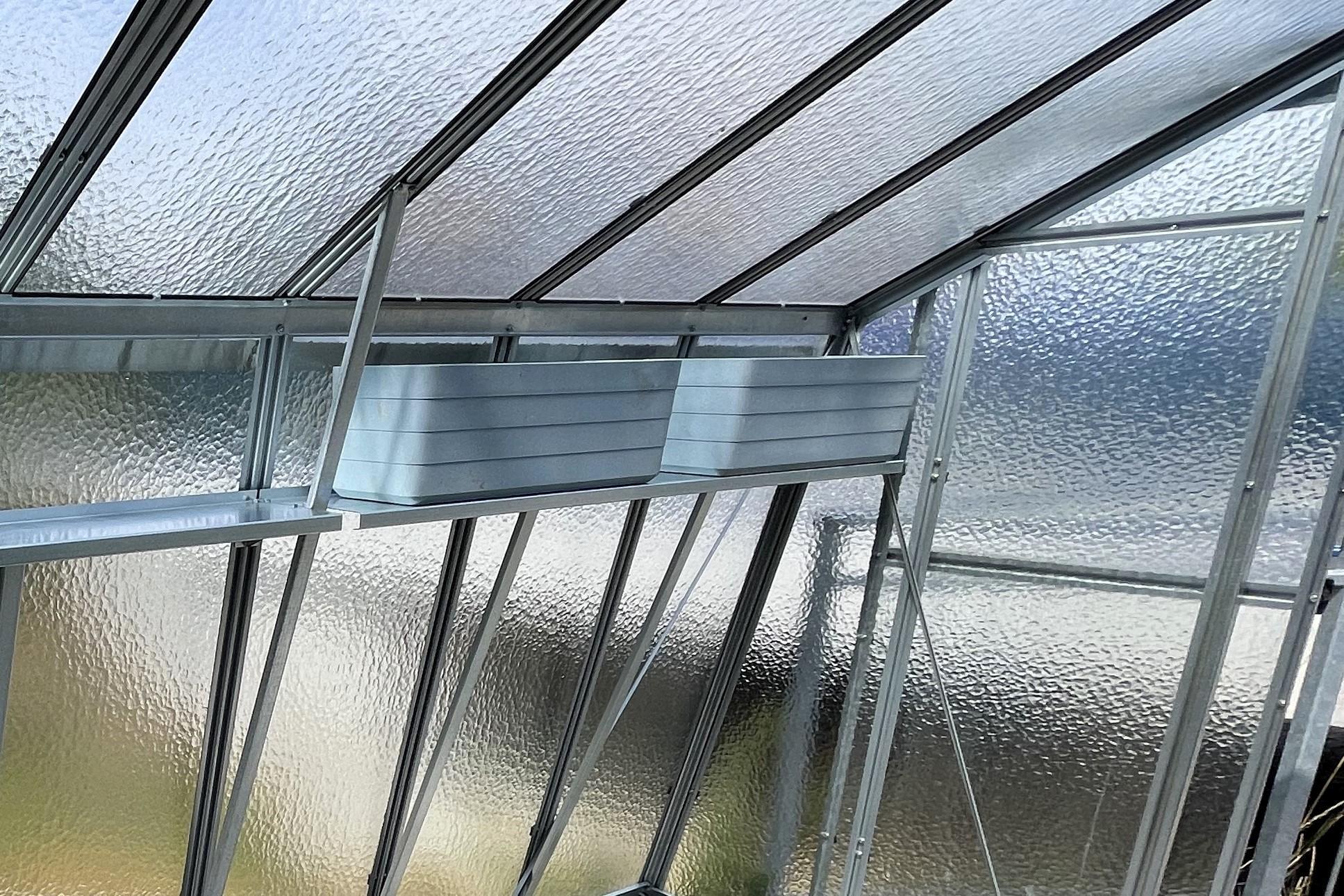 Upozornění - ve fotogalerii se nachází fotografie ze skleníku Hobby H 7 (police však vypadají úplně stejně, jenom jsou uzpůsobeny pro kolmé stěny skleníku).