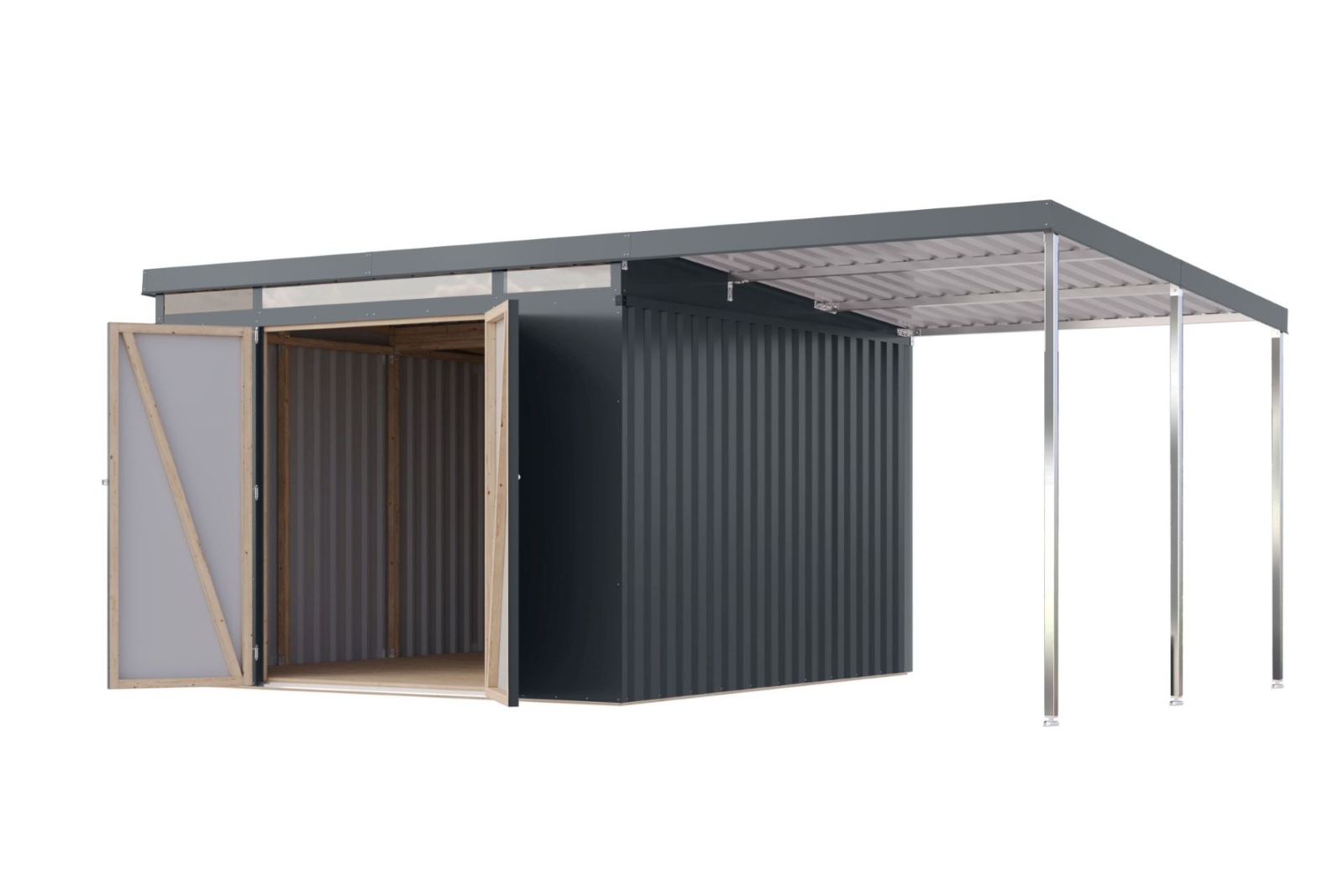 Odolný plechový domek IRIDIUM 3,5 s moderním vzhledem a pevnou konstrukcí z lepeného lamelového dřeva (BSH) pro maximální stabilitu i snadnou montáž. Trapézový plech chrání před korozí, UV zářením i nepřízní počasí a je nenáročný na údržbu.