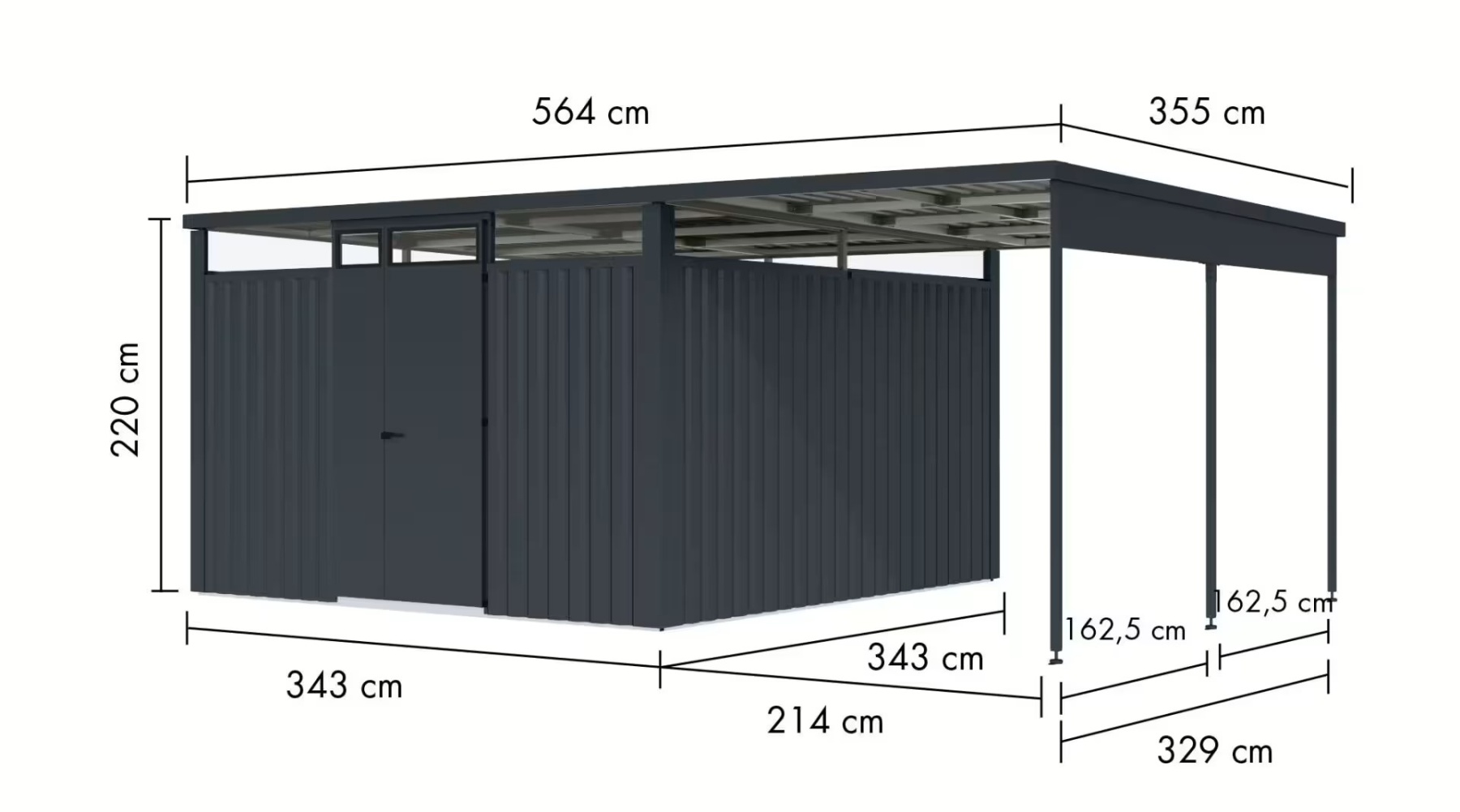 Trapézový plech je pečlivě práškově lakován, což nejen dodává estetický vzhled, ale také zajišťuje vynikající odolnost vůči nepříznivým povětrnostním vlivům. Rám z pozinkovaných čtvercových ocelových trubek zaručuje stabilitu a pevnost konstrukce. Světelný pás z umělého skla umožňuje pronikání přirozeného světla do interiéru, čímž vytváří příjemnou, světlou a pohodovou atmosféru uvnitř domku. Součástí dodávky je kvalitní okap, který efektivně odvádí dešťovou vodu.