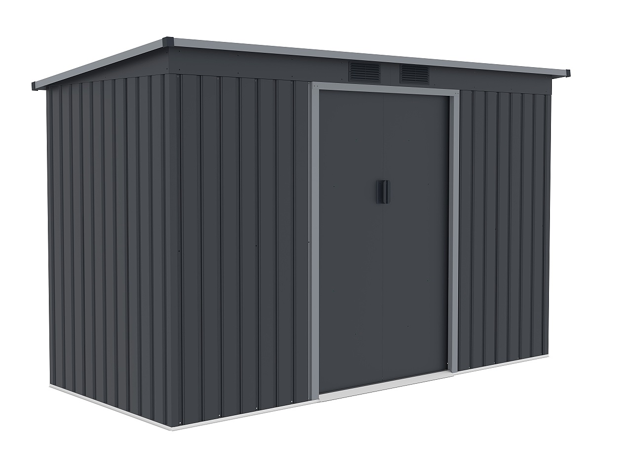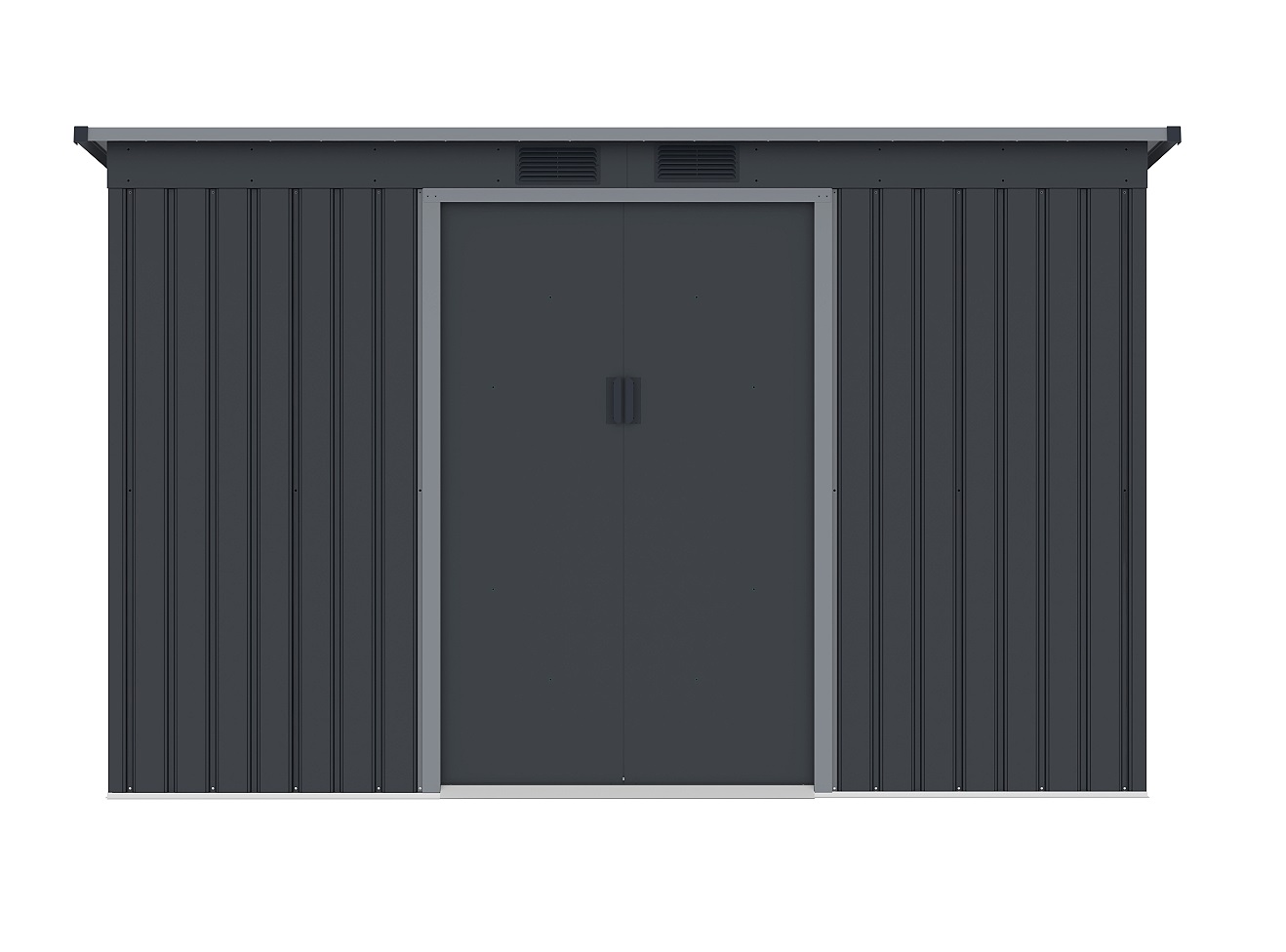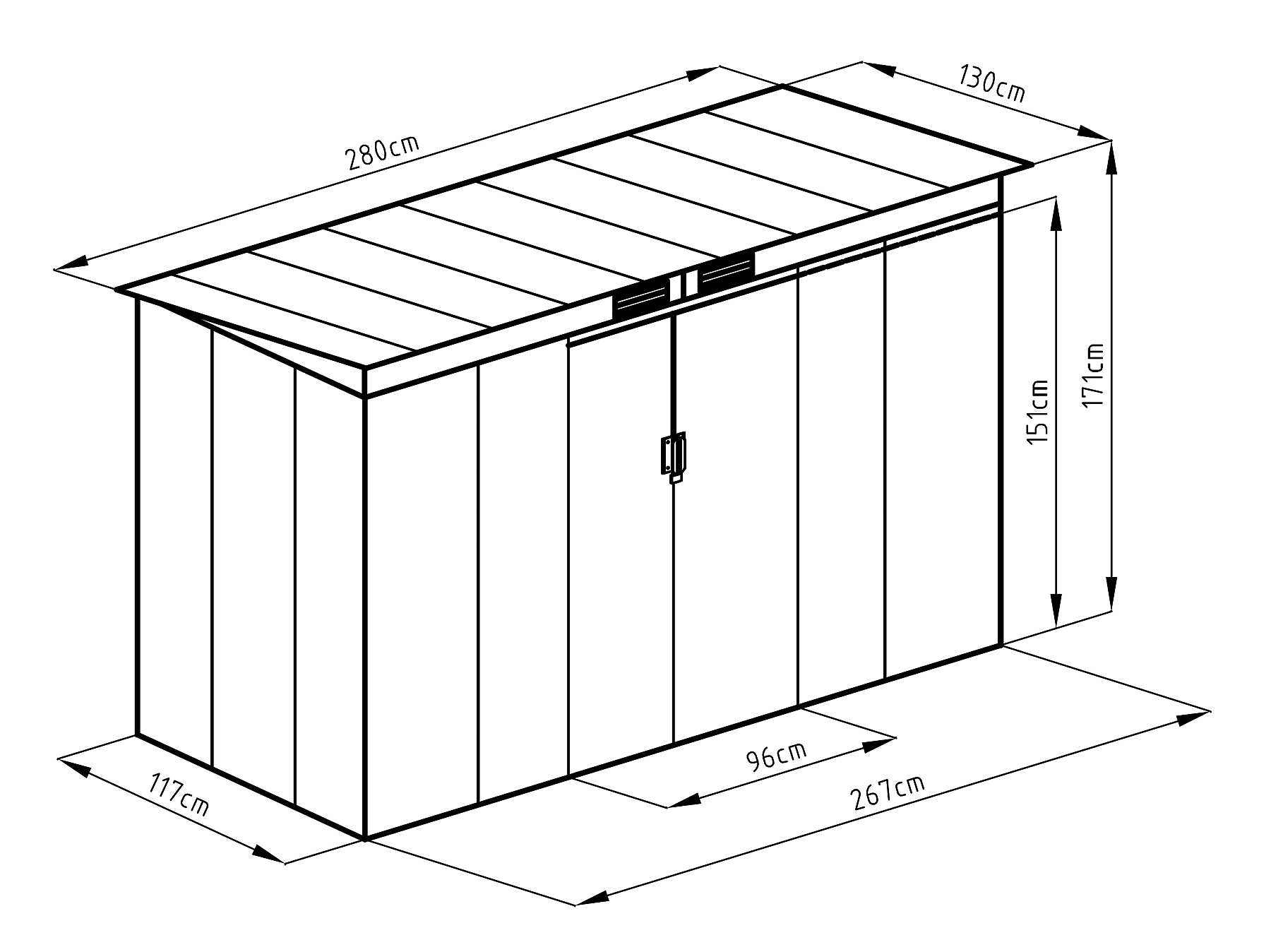 Klasická pultová střecha poskytuje dostatek prostoru a umožňuje efektivní odvod dešťové vody. Čelní vnitřní posuvné dvoukřídlé dveře o rozměru 96 x 151 cm usnadňují přístup do domku.