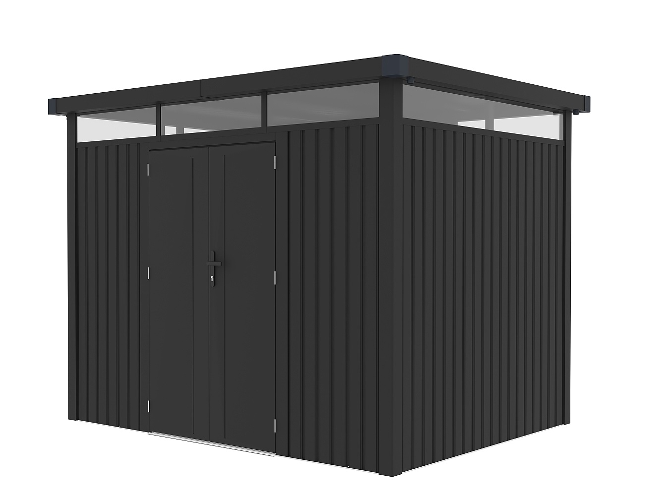 Tato praktická konstrukce váží 199 kg a má antracitovou barvu, která se snadno začlení do každého venkovního prostředí. Plochá střecha a dvojité křídlové dveře o rozměrech š 106 x v 178 cm dodávají domku jednoduchý a moderní vzhled.
