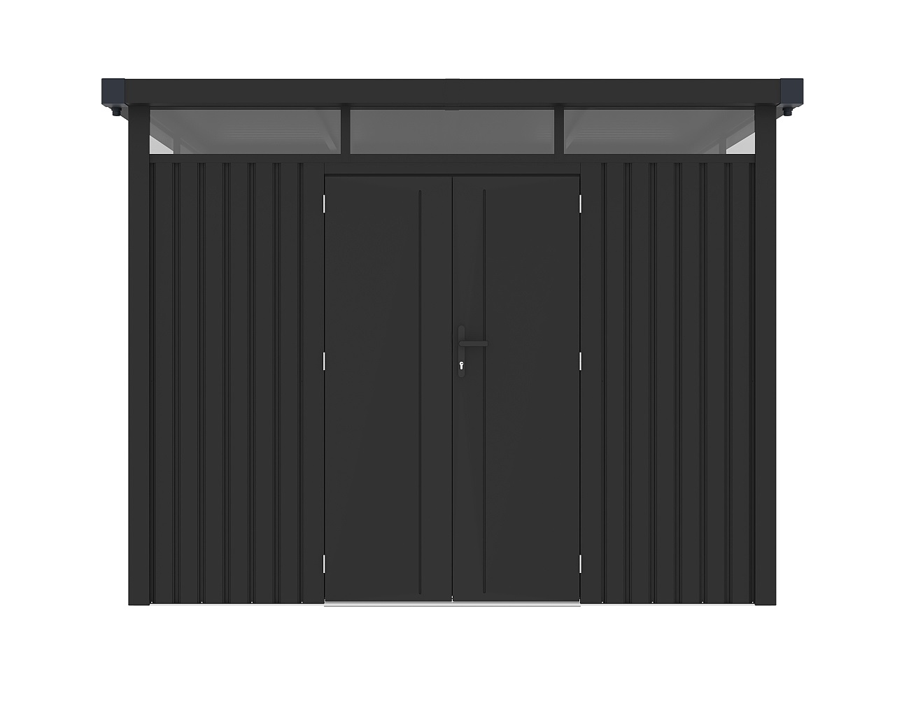 Dvojité křídlové dveře, které lze bezpečně uzamknout, zajišťují pohodlný přístup dovnitř, kde najdete dostatek prostoru pro úschovu jízdních kol, zahradního nářadí, květináčů, nebo příslušenství k bazénu. Prosvětlené vrchní části panelů a otevíratelné okno dodávají domku svěžest a vzdušnost.