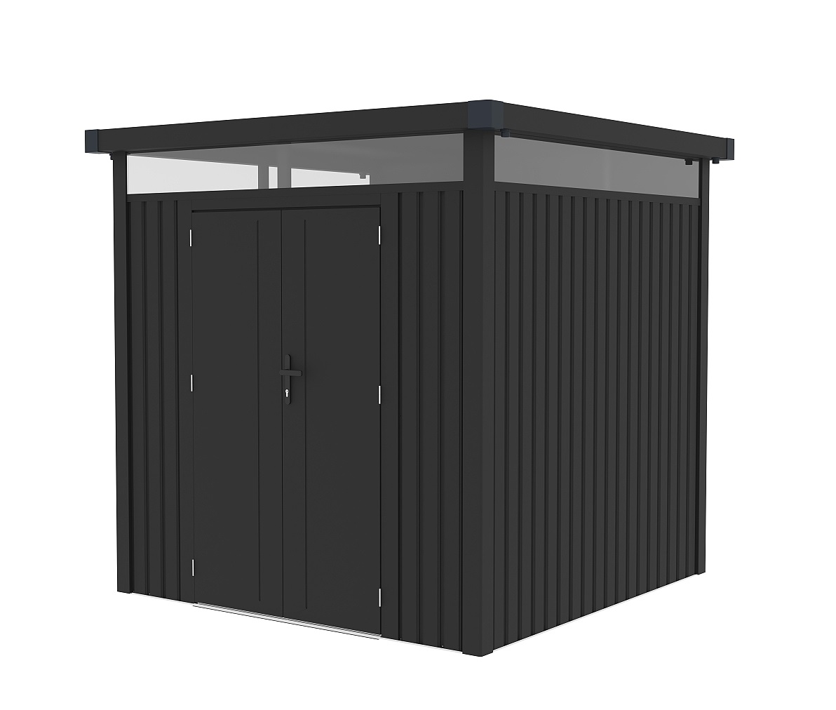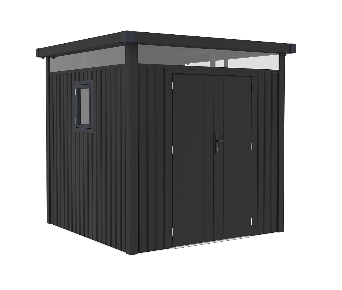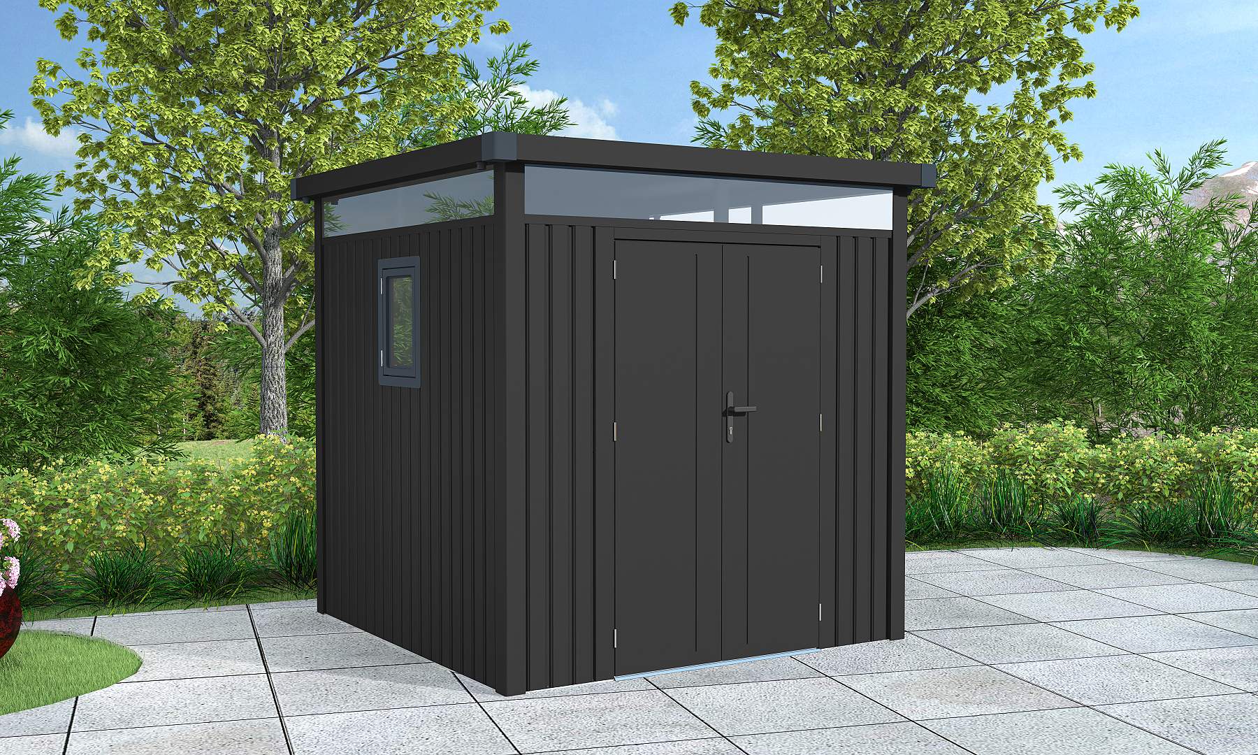 Dvojité křídlové dveře, které lze bezpečně uzamknout, zajišťují pohodlný přístup dovnitř, kde najdete dostatek prostoru pro úschovu jízdních kol, zahradního nářadí, květináčů, nebo příslušenství k bazénu. Prosvětlené vrchní části panelů a otevíratelné okno dodávají domku svěžest a vzdušnost.