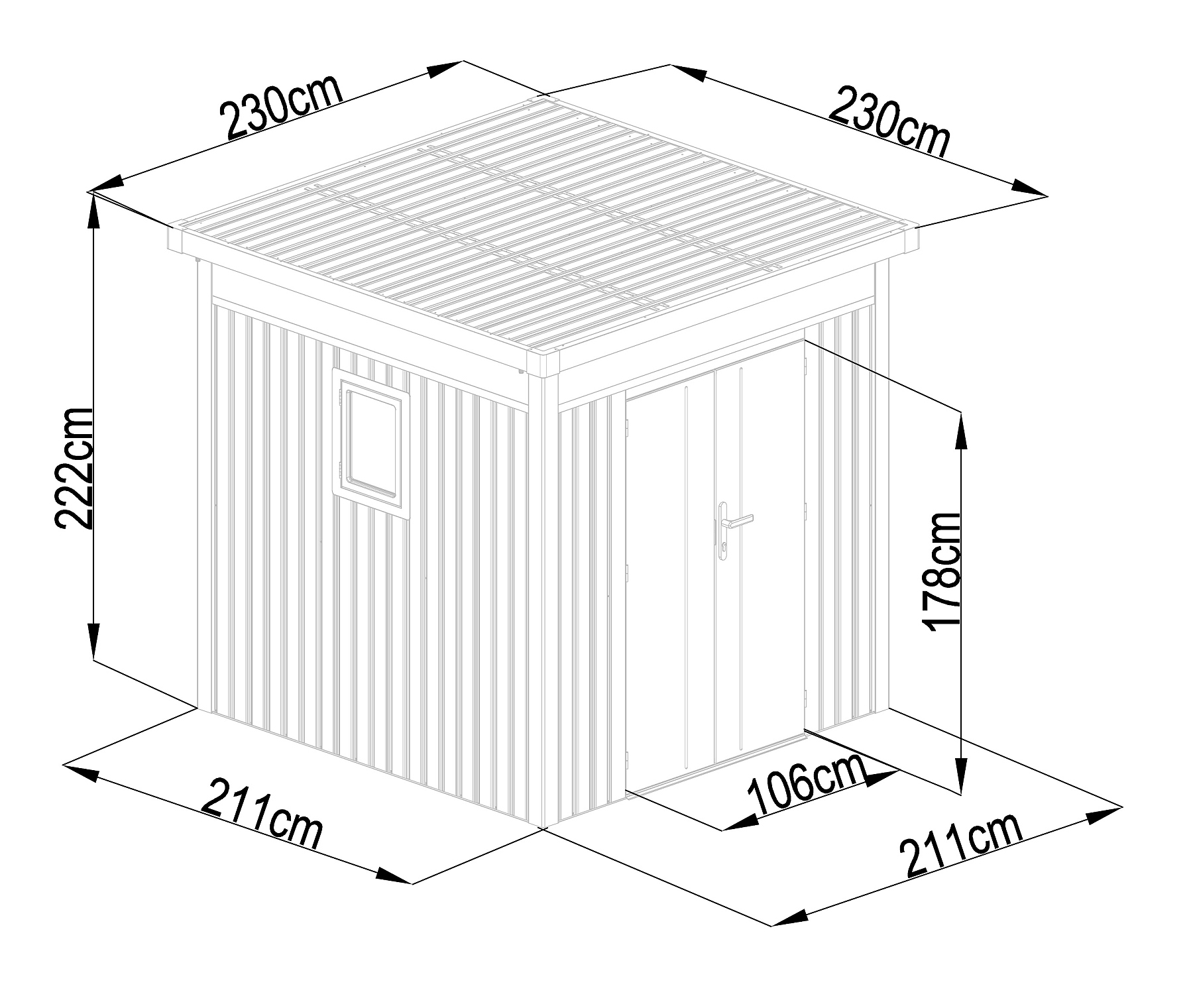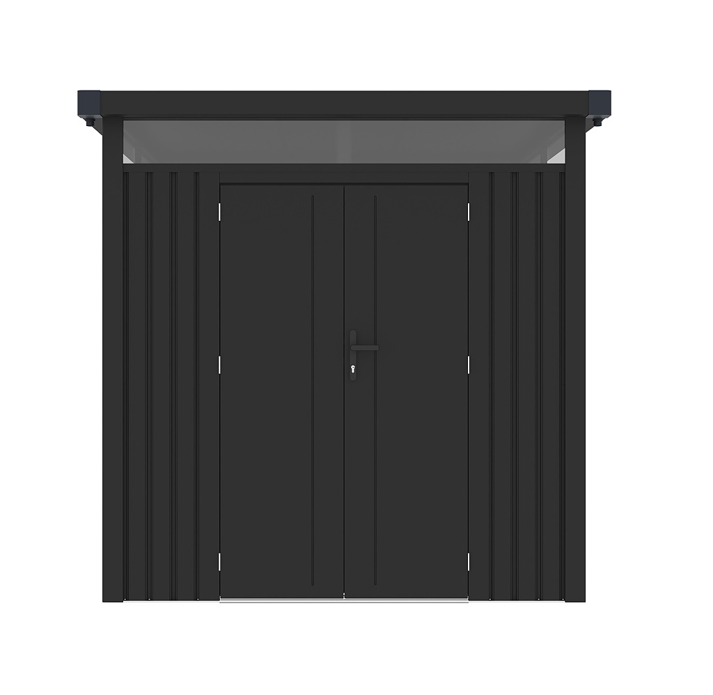Tato praktická konstrukce váží 174 kg a má antracitovou barvu, která se snadno začlení do každého venkovního prostředí. Plochá střecha a dvojité křídlové dveře o rozměrech š 106 x v 178 cm dodávají domku jednoduchý a moderní vzhled.