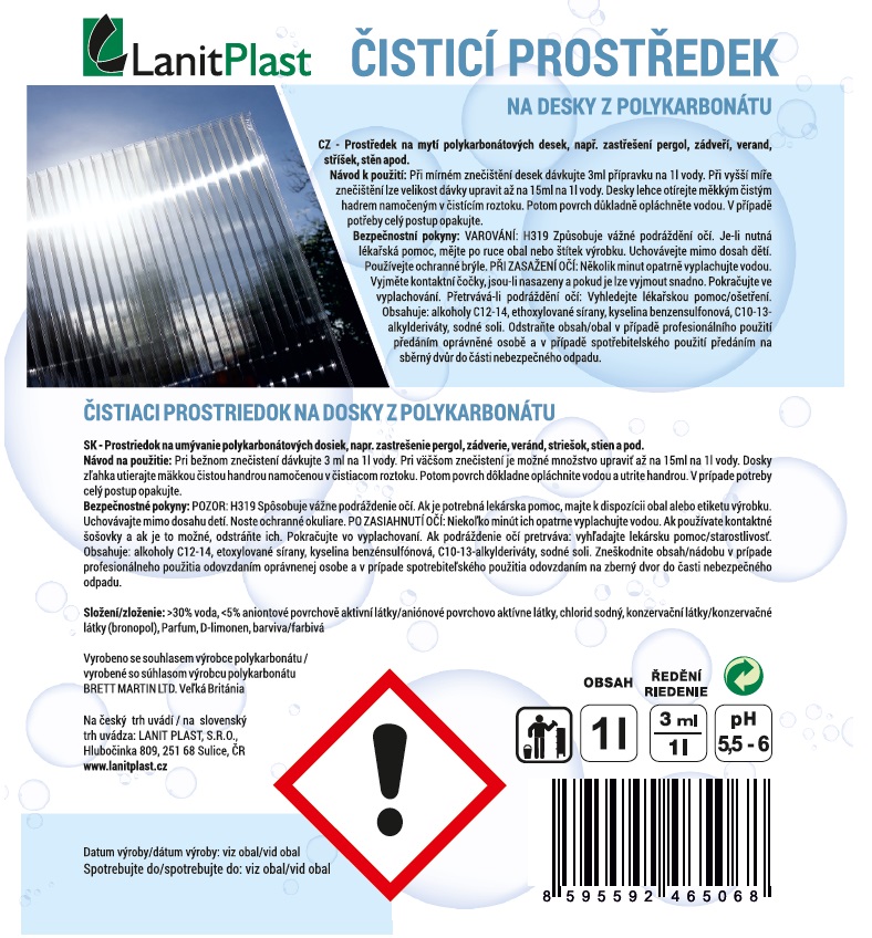 Koncentrát, obsah 1 L, vhodné na větší plochy polykarbonátových desek jako jsou pergoly, stěny, střechy. Z 1 litru koncentrátu vyrobíte až 333 litrů čisticího roztoku.