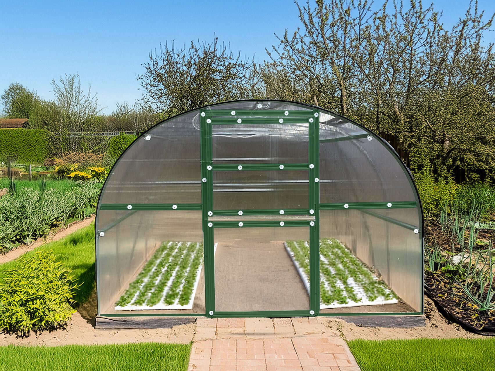 Konstrukce - konstrukce skleníku je sešroubovaná z pozinkovaných omega profilů síly 0,6 mm. Materiál profilů je galvanicky pozinkovaný. Jednotlivá žebra nosných oblouků jsou od sebe vzdálena 100 cm. Dvě podpěry na každém oblouku garantují vysokou únosnost celé konstrukce skleníku. Přední čelo skleníku má vestavěné jednokřídlé dělené dveře o světlosti 95 x 186 cm a na zadním čele je ventilační okno o rozměrech š 95 x v 90 cm. Pokud otevřete horní část dveří a zadní okno, zajistíte tím pohodlné větrání celého skleníku, aniž by do něj měly přístup děti nebo domácí zvířata. Obsahem dodávky každého skleníku je jedno střešní okno s manuálním ovládáním (otevřeno / zavřeno). K oknu doporučujeme dokoupit automatický otvírač, který otvírání a zavírání okna na základě teploty ve skleníku zařídí za Vás.