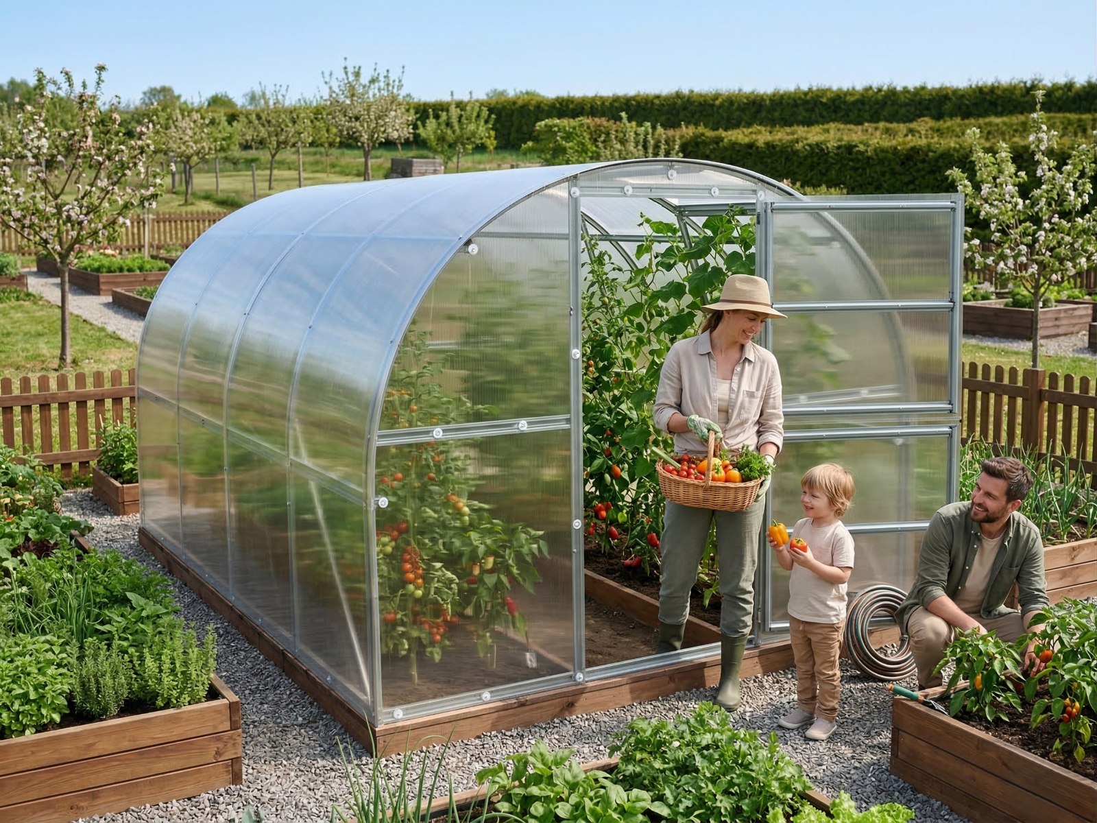 Konstrukce - konstrukce skleníku je sešroubovaná z pozinkovaných omega profilů síly 0,6 mm. Materiál profilů je galvanicky pozinkovaný. Jednotlivá žebra nosných oblouků jsou od sebe vzdálena 100 cm. Dvě podpěry na každém oblouku garantují vysokou únosnost celé konstrukce skleníku. Přední čelo skleníku má vestavěné jednokřídlé dělené dveře o světlosti 95 x 186 cm a na zadním čele je ventilační okno o rozměrech š 95 x v 90 cm. Pokud otevřete horní část dveří a zadní okno, zajistíte tím pohodlné větrání celého skleníku, aniž by do něj měly přístup děti nebo domácí zvířata. Obsahem dodávky každého skleníku je jedno střešní okno s manuálním ovládáním (otevřeno / zavřeno). K oknu doporučujeme dokoupit automatický otvírač, který otvírání a zavírání okna na základě teploty ve skleníku zařídí za Vás. Polykarbonát - dvoustěnný polykarbonát 4 mm se silným UV filtrem vyrobený v EU (proto na slunci nežloutne a nekřehne). Smluvní prodloužená záruka 5 let na nerozbitnost polykarbonátu krupobitím.