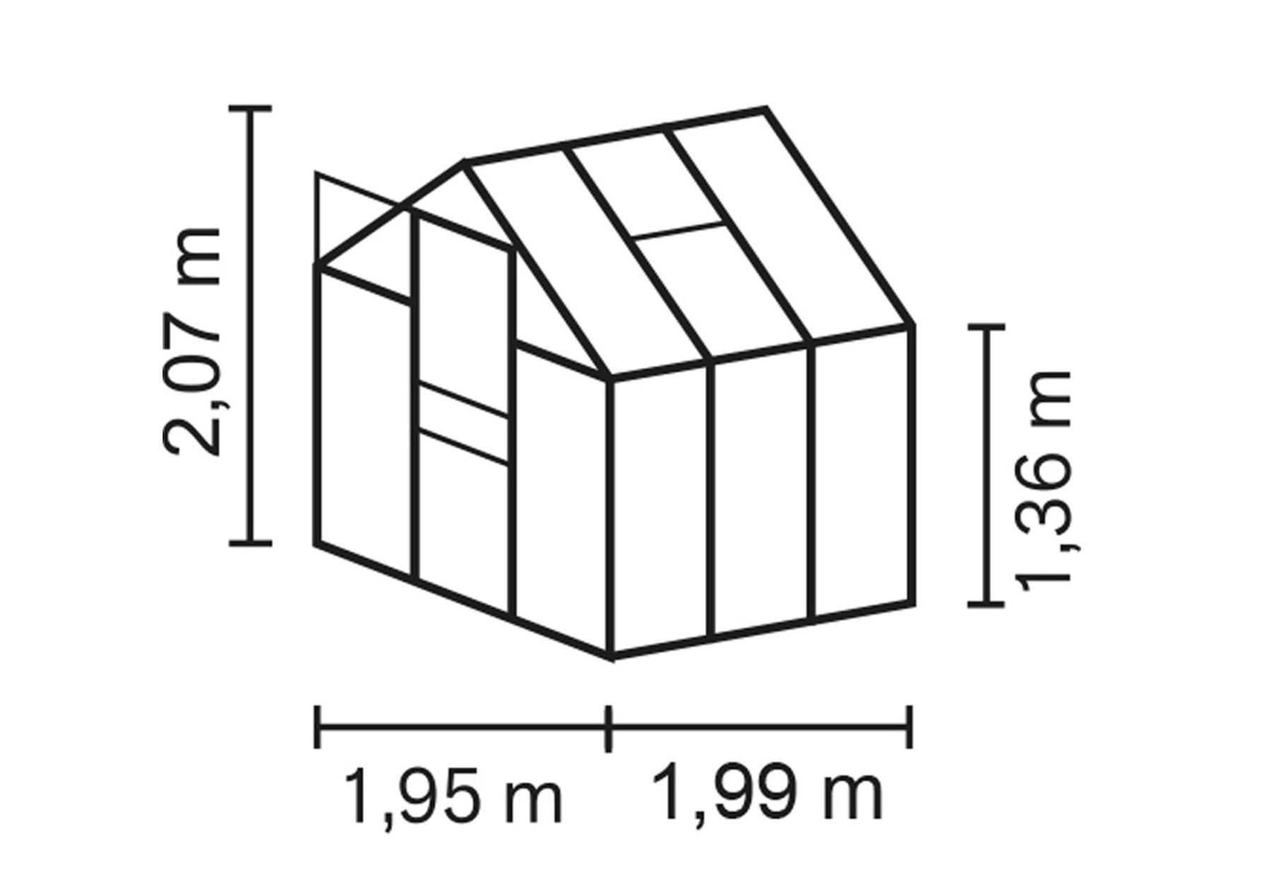 Obsahem balení jsou jednokřídlé posuvné dveře (š x v otvoru = 0,61 x 1,74 m), AL profily, prosklení, pozinkovaná ocelová základna, 1x střešní ventilační okénko s manuálním otevíráním, veškerý spojovací materiál. Ke skleníku je možné dokoupit řadu nadstandardního příslušenství - poličky, regály, další větrací střešní okno, automatický otvírač, okapové sady, teploměry, vlhkoměry, zavlažovací zařízení, elektrické odporové vytápění půdy.