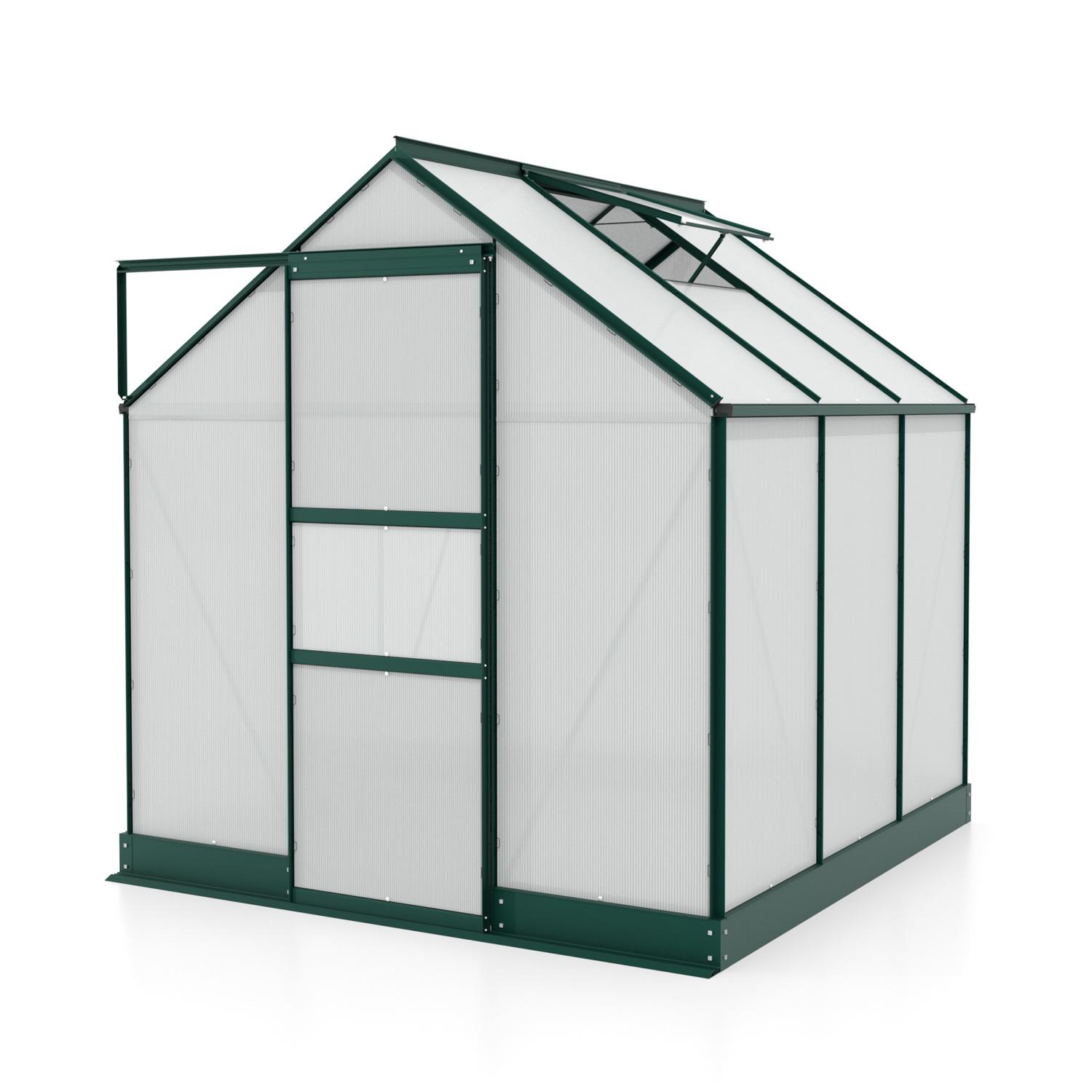 Obsahem balení jsou jednokřídlé posuvné dveře (š x v otvoru = 0,61 x 1,74 m), AL profily, prosklení, pozinkovaná ocelová základna, 1x střešní ventilační okénko s manuálním otevíráním, veškerý spojovací materiál. Ke skleníku je možné dokoupit řadu nadstandardního příslušenství - poličky, regály, další větrací střešní okno, automatický otvírač, okapové sady, teploměry, vlhkoměry, zavlažovací zařízení, elektrické odporové vytápění půdy.