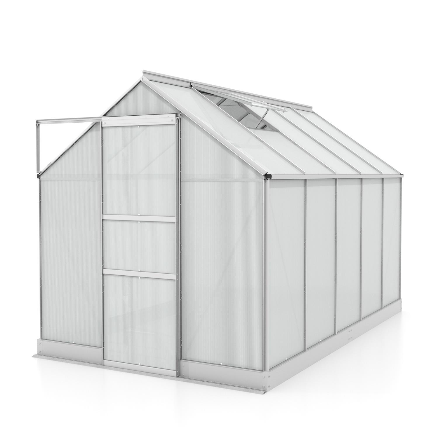 Obsahem balení jsou jednokřídlé posuvné dveře (š x v otvoru = 0,61 x 1,74 m), AL profily, prosklení, pozinkovaná ocelová základna, 2x střešní ventilační okénka s manuálním otevíráním, veškerý spojovací materiál. Ke skleníku je možné dokoupit řadu nadstandardního příslušenství - poličky, regály, další větrací střešní okno, automatický otvírač, okapové sady, teploměry, vlhkoměry, zavlažovací zařízení, elektrické odporové vytápění půdy.